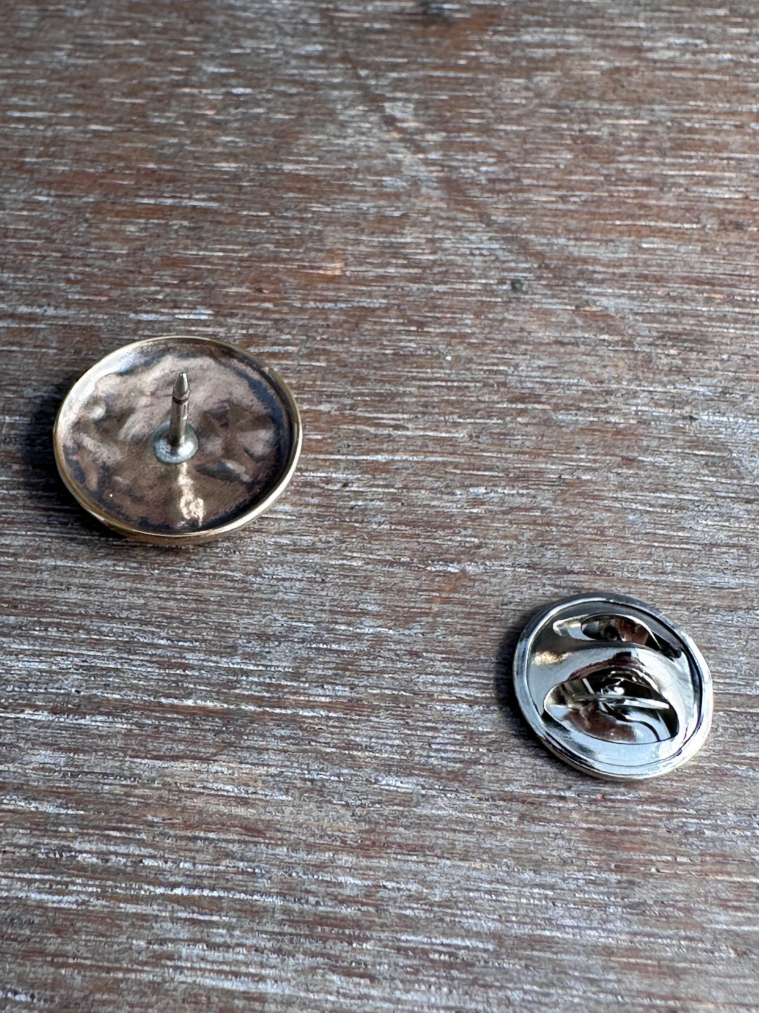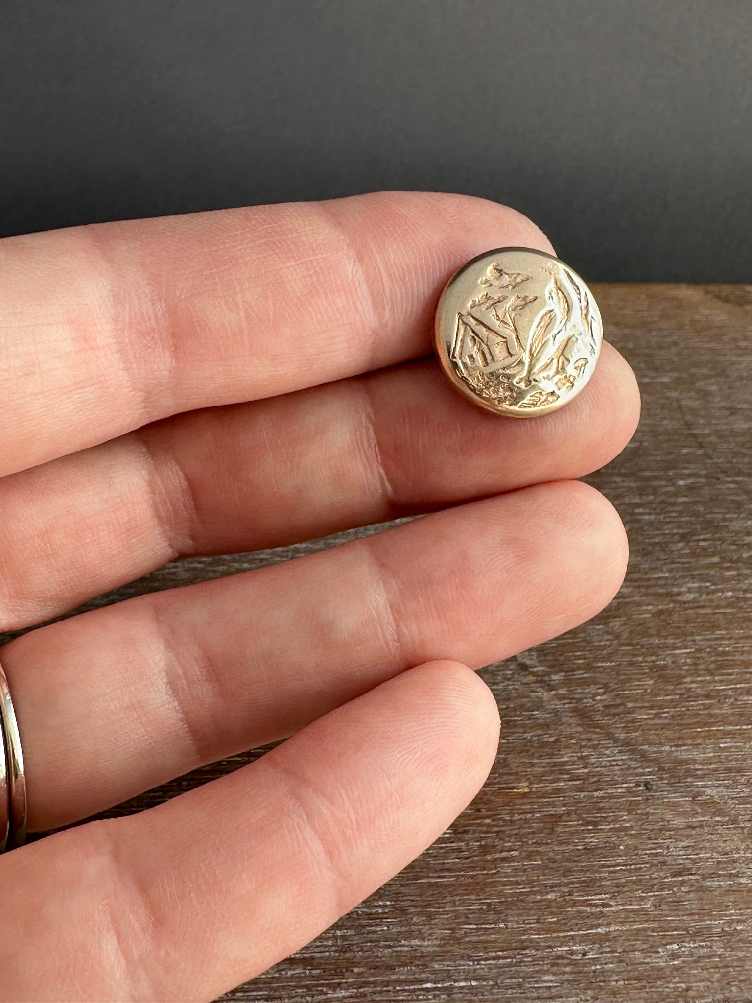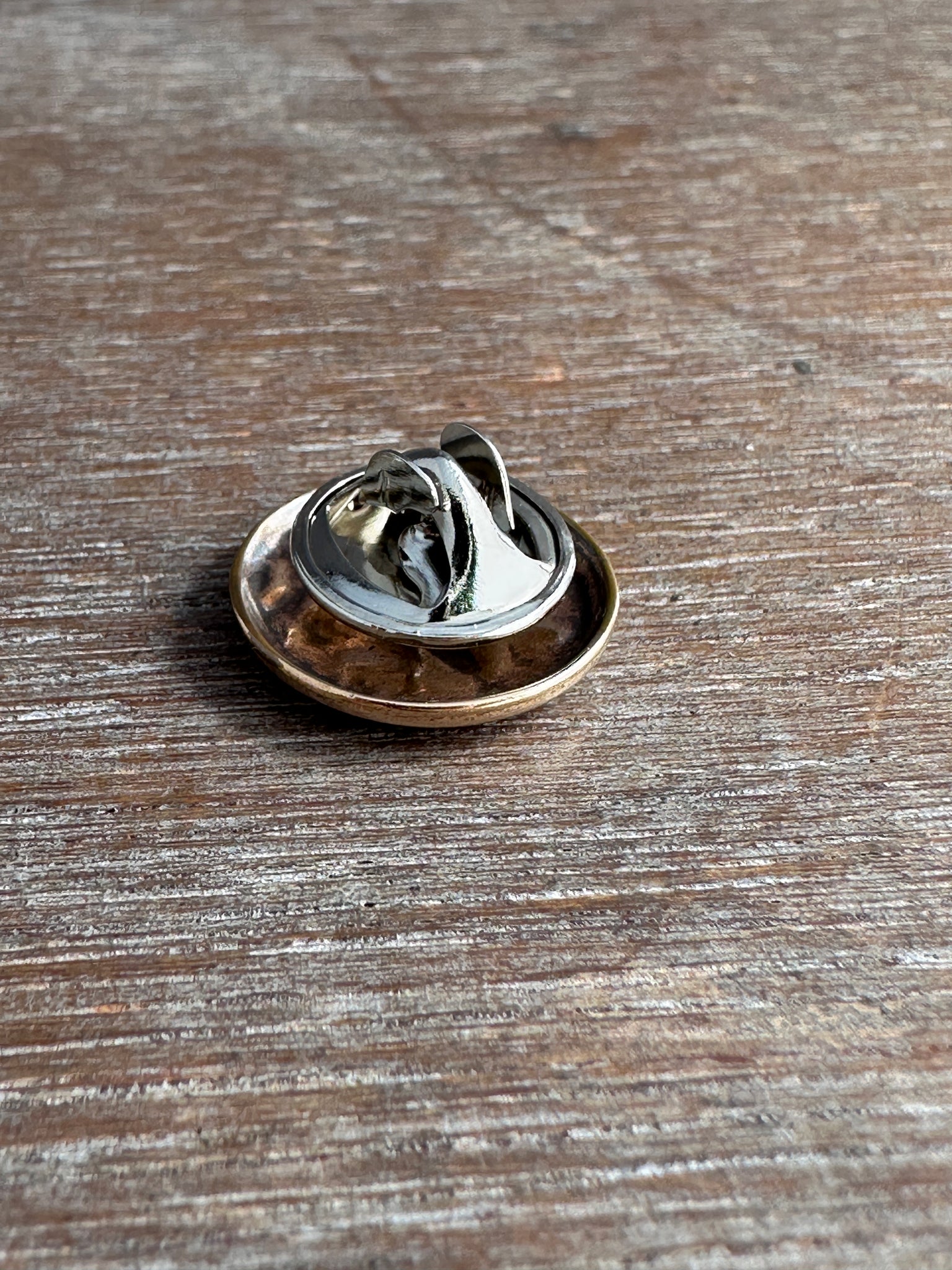 This little bird and home button was created by pressing metal into an antique die. It is made with 14k gold fill, and has a nickel silver pin backing soldered onto It. It can be pinned on any sturdy fabric apparel.