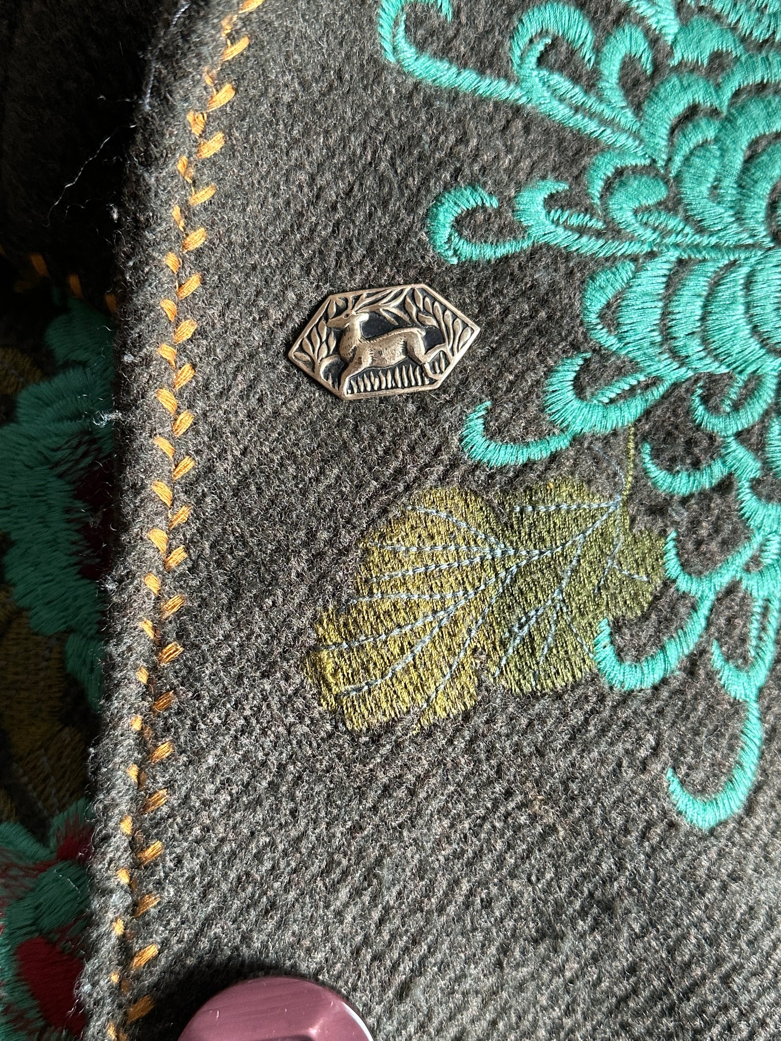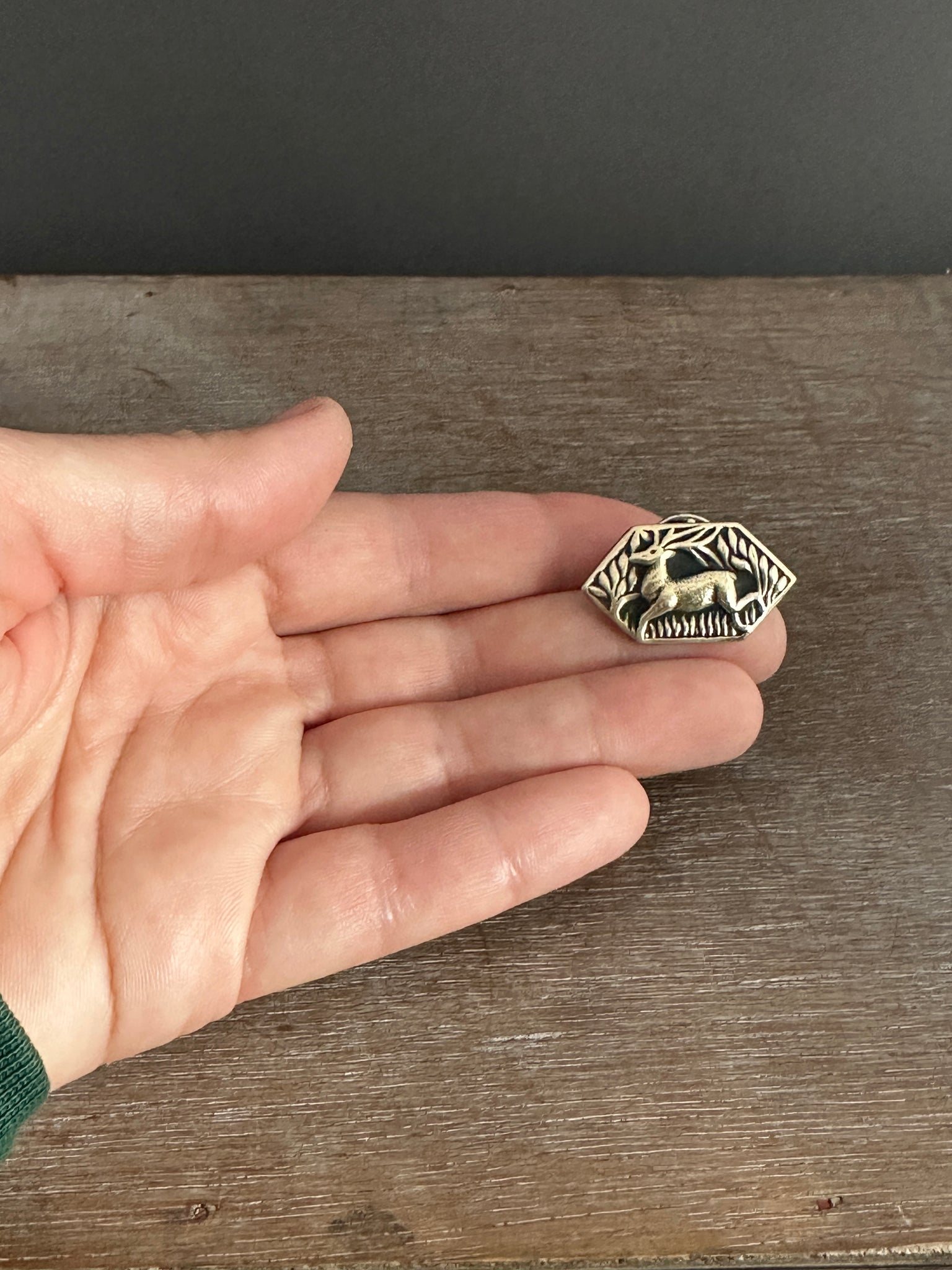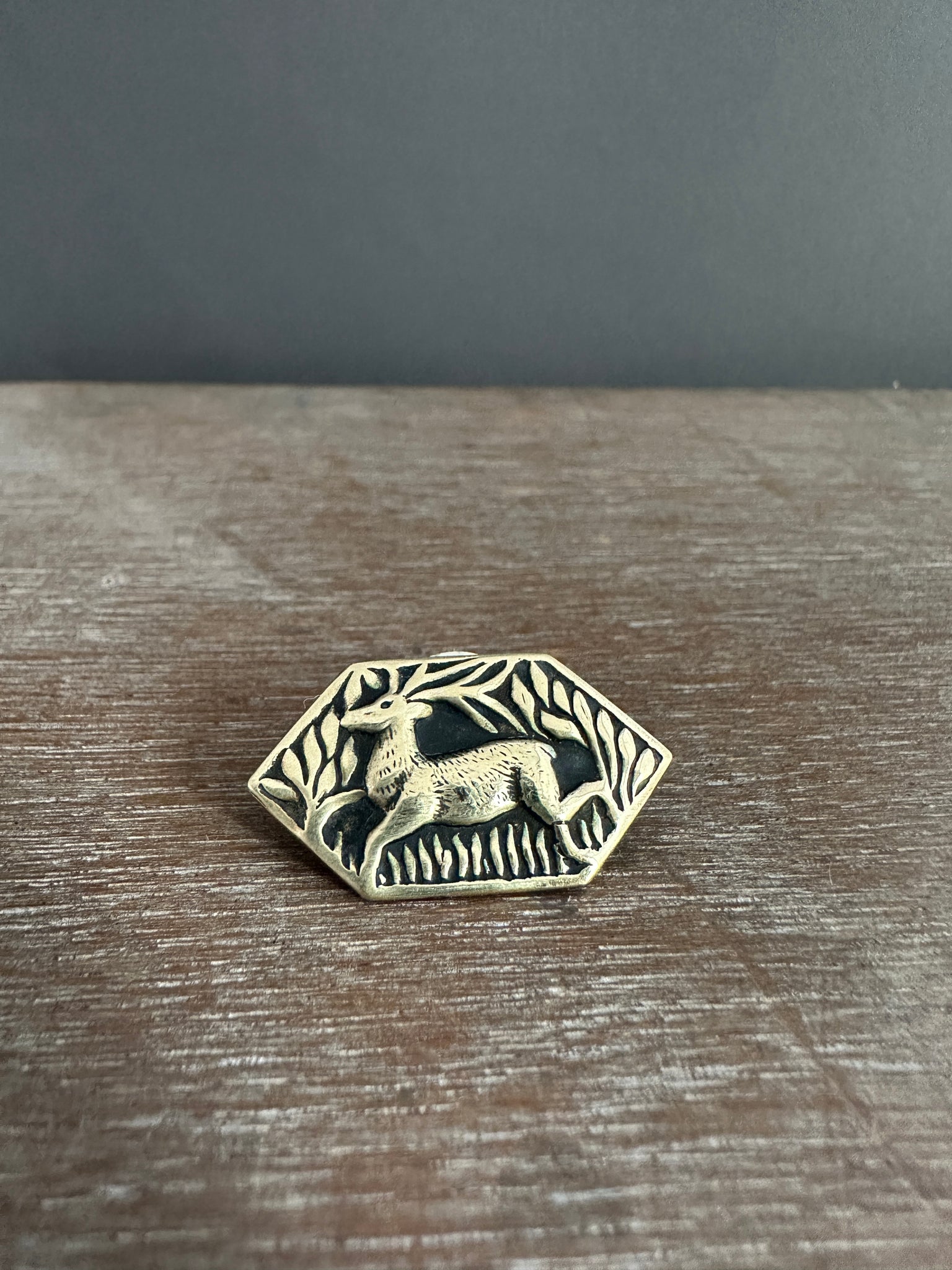 This deer pin was created by pressing metal into an antique die. It is made with a bronze colored brass, and has a nickel silver pin backing soldered onto It. It can be pinned on any sturdy fabric apparel.
