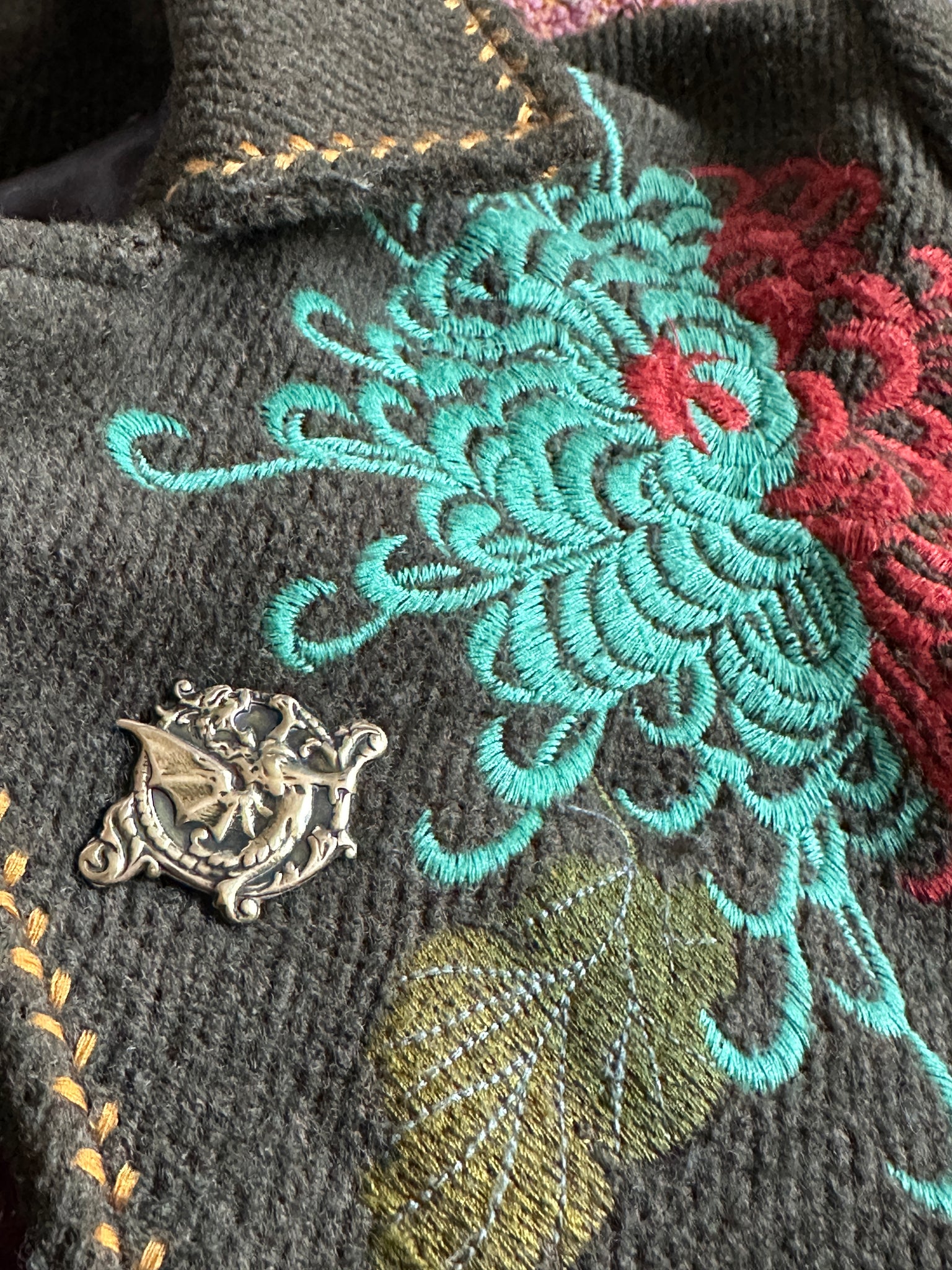 This regal dragon medallion was created by pressing metal into an antique die.  It is made with a bronze colored brass, and has a nickel silver pin backing soldered onto It. It can be pinned on any sturdy fabric apparel.
