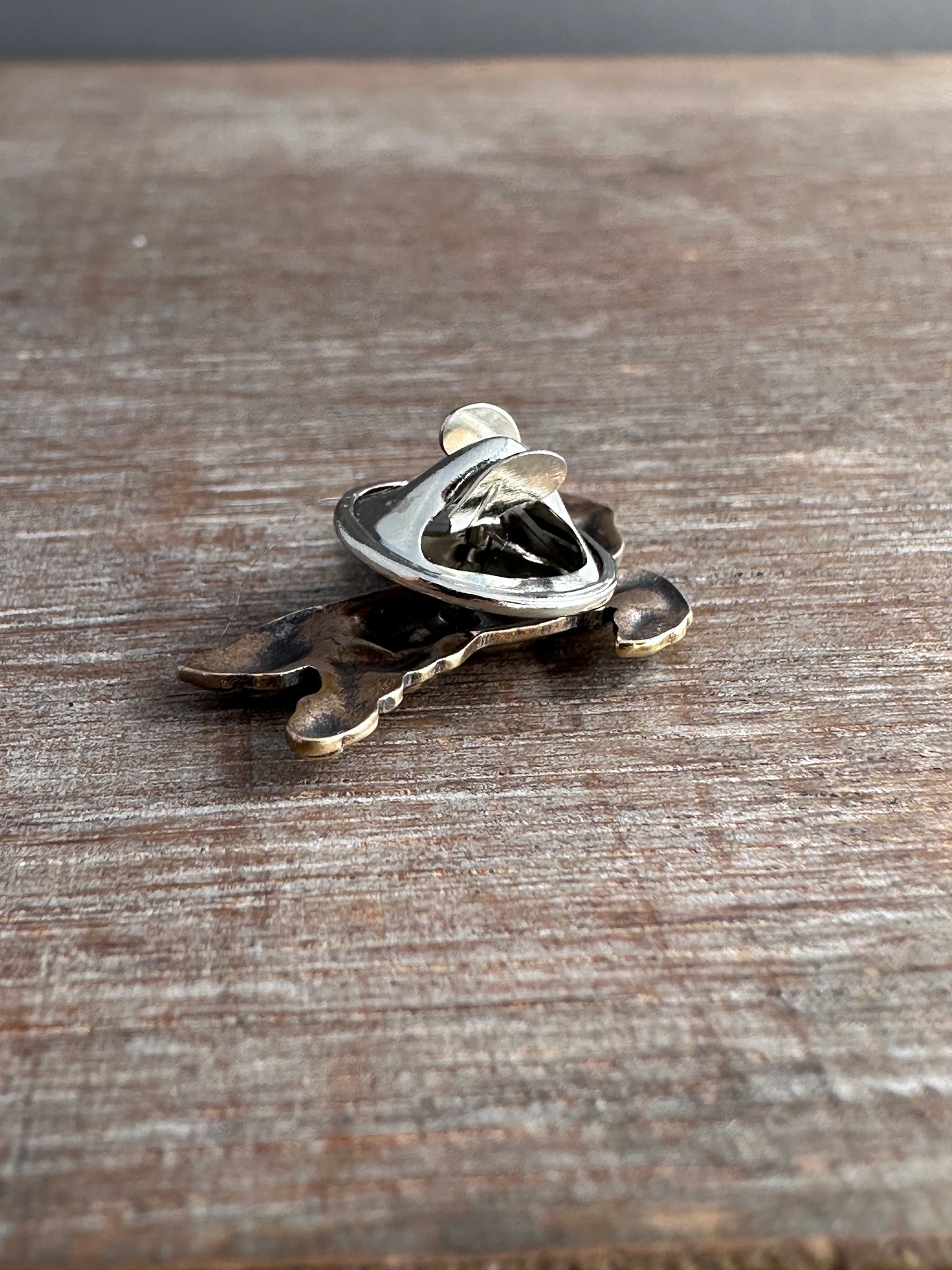 This highly detailed horse was created by pressing metal into an antique die. It is made with a bronze colored brass, and has a nickel silver pin backing soldered onto It. It can be pinned on any sturdy fabric apparel.