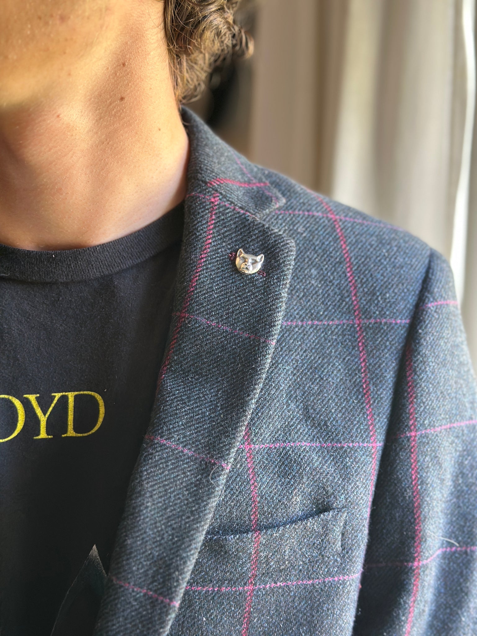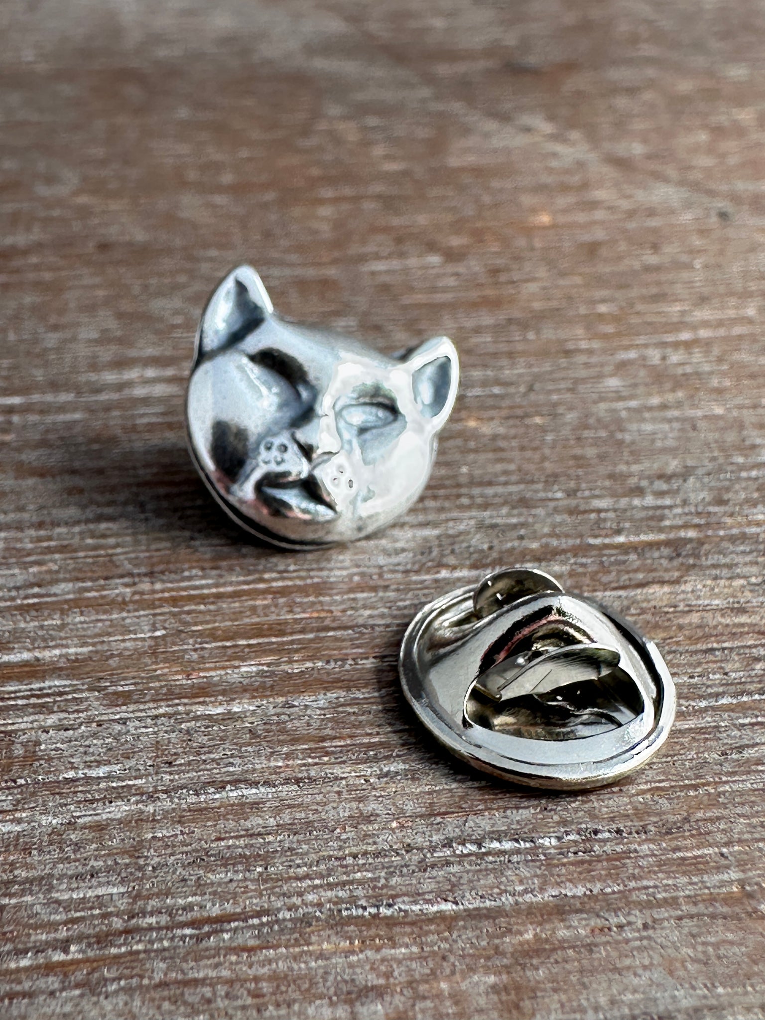 This little cat head was created by pressing metal into an antique die. It is made with sterling silver, and has a nickel silver pin backing soldered onto It. It can be pinned on any sturdy fabric apparel.