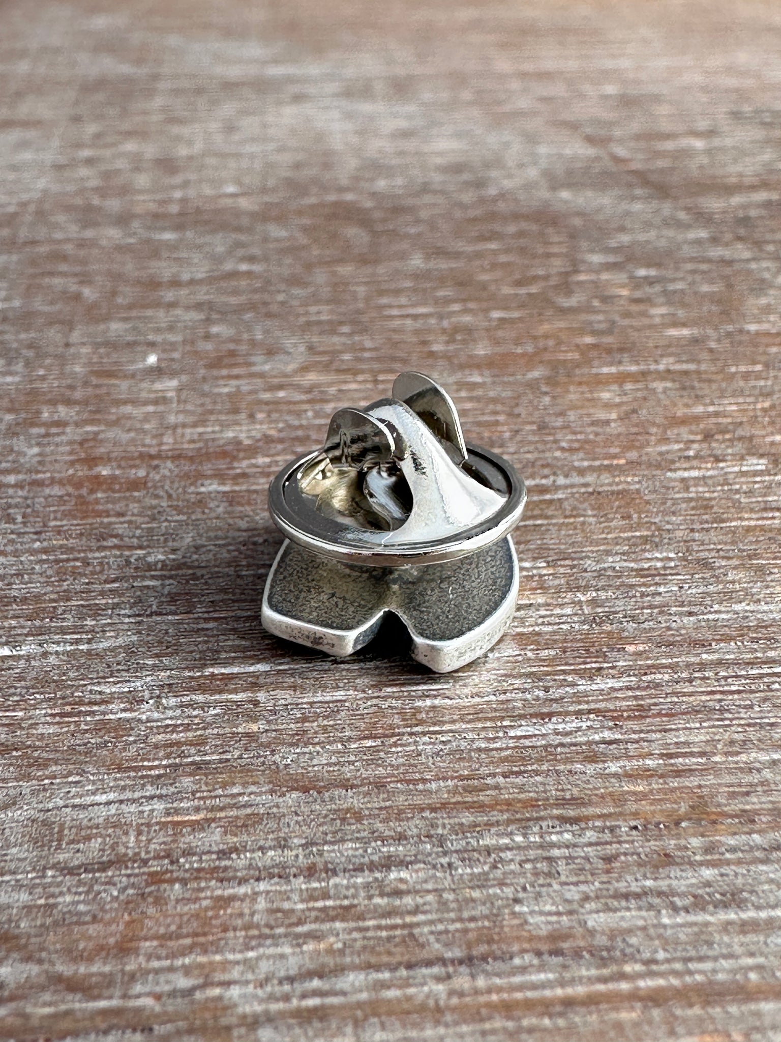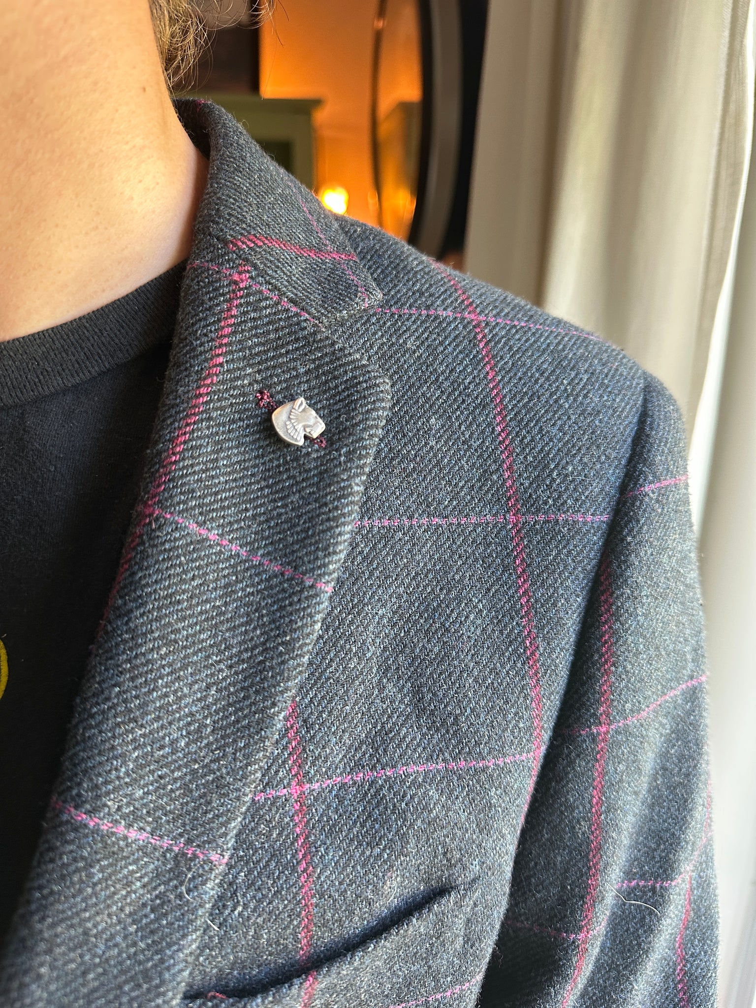 This little lioness head was created by pressing metal into an antique die. It is made with sterling silver, and has a nickel silver pin backing soldered onto It. It can be pinned on any sturdy fabric apparel.