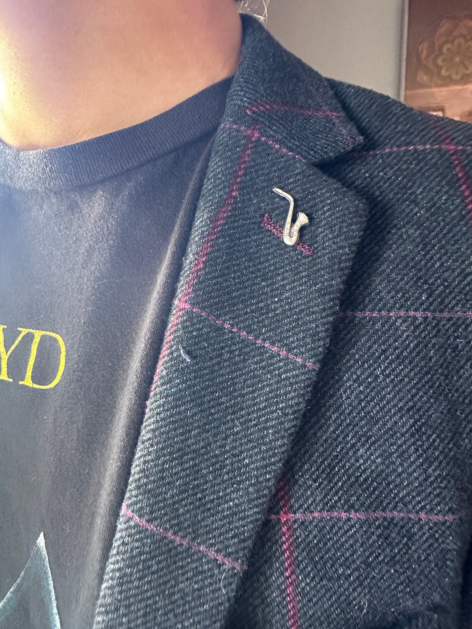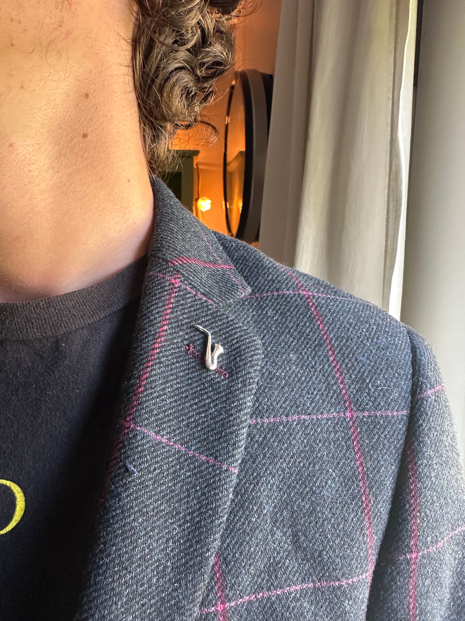 This little saxophone was created by pressing metal into an antique die. It is made with sterling silver, and has a nickel silver pin backing soldered onto It. It can be pinned on any sturdy fabric apparel.