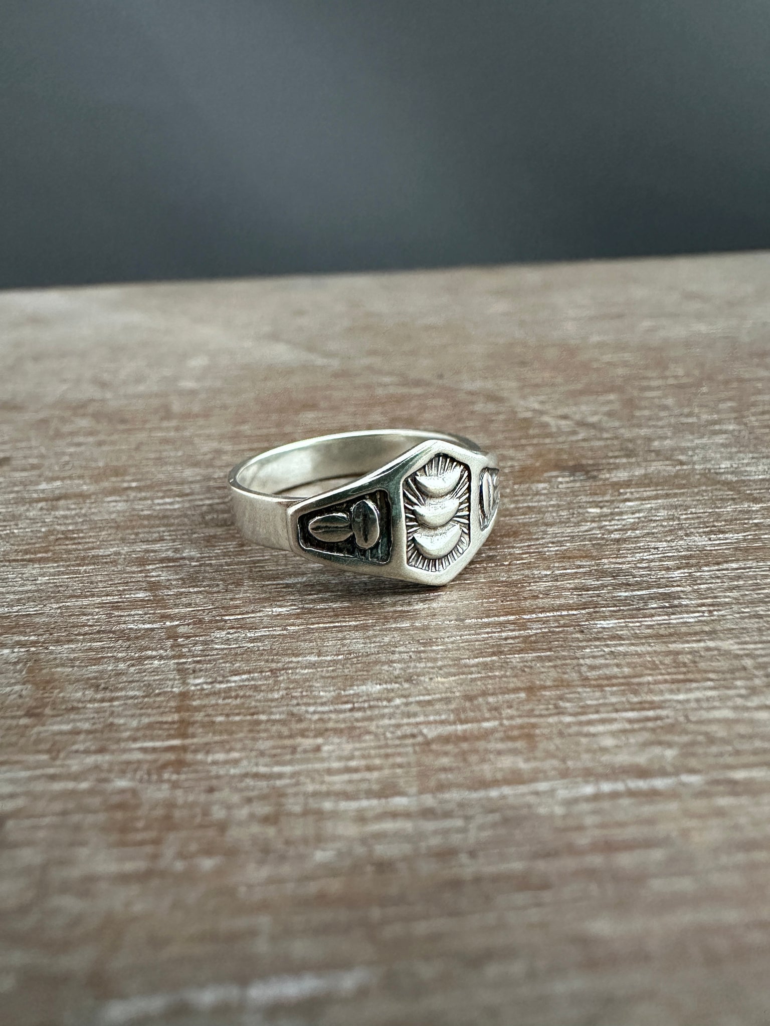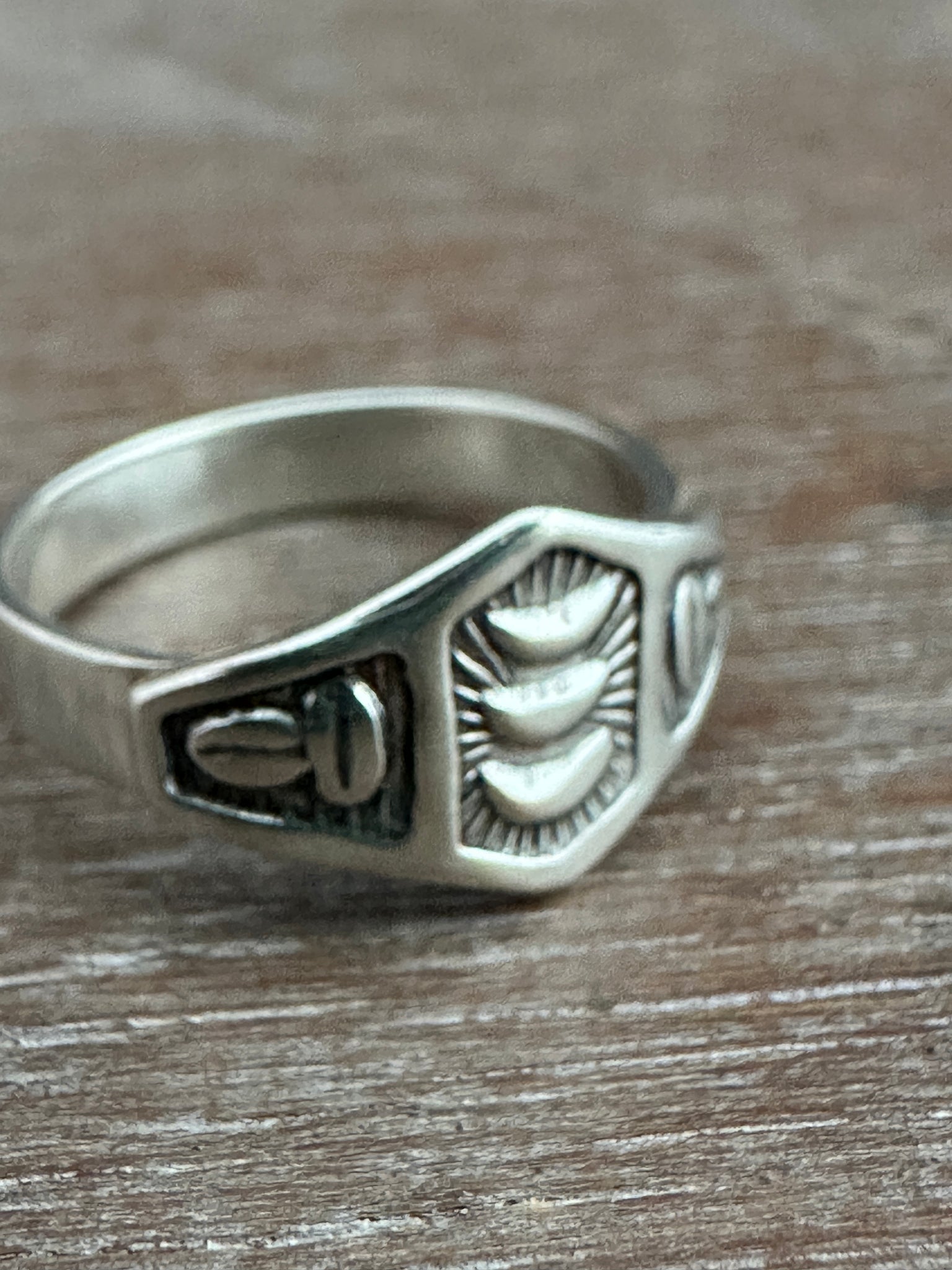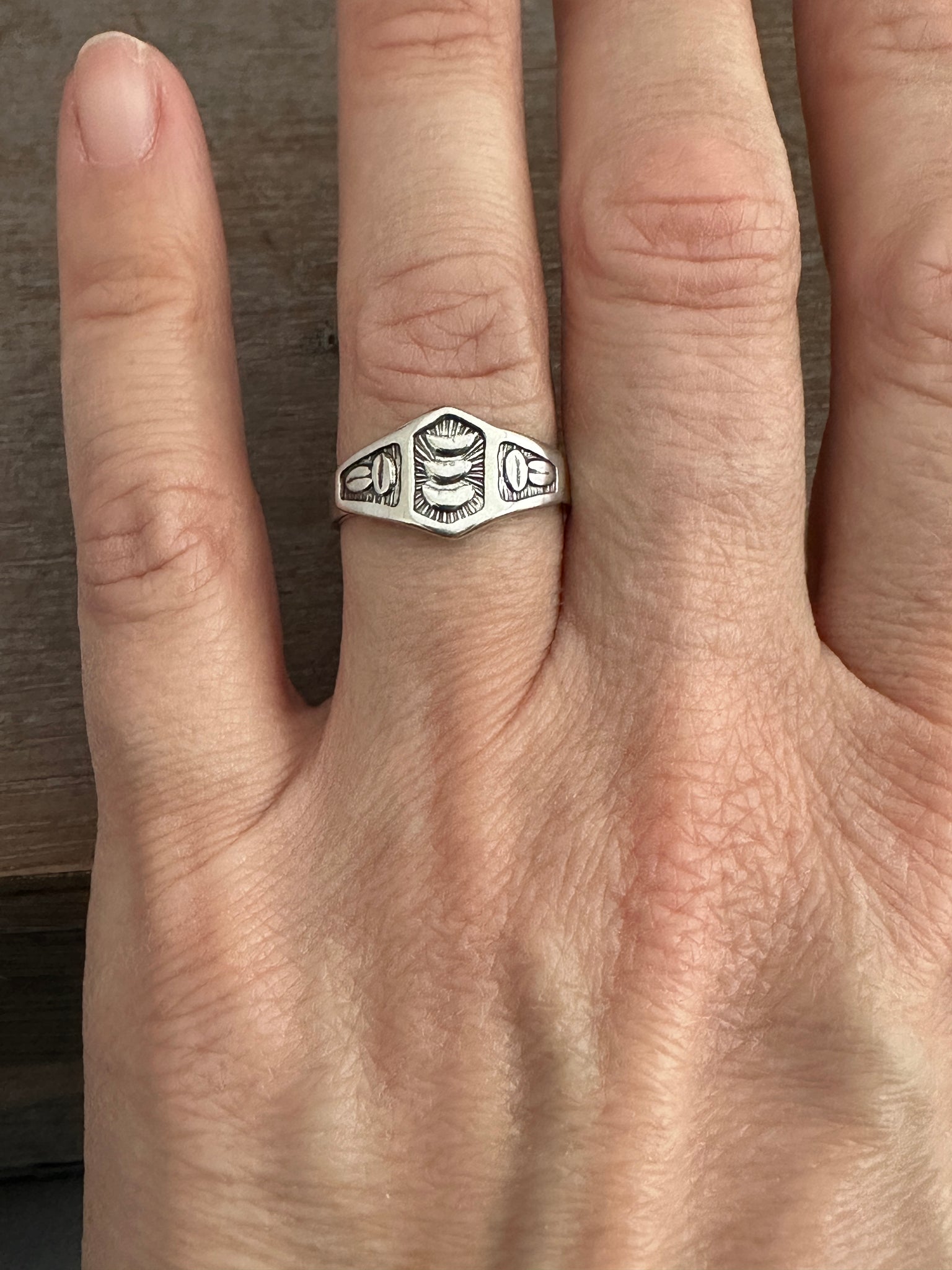This delicate sterling silver ring is made with vintage and rare handmade die. The design is stamped onto very thick silver, and then I hand cut it out with a saw. The shape that is created is then soldered onto a 16 gauge ring band.