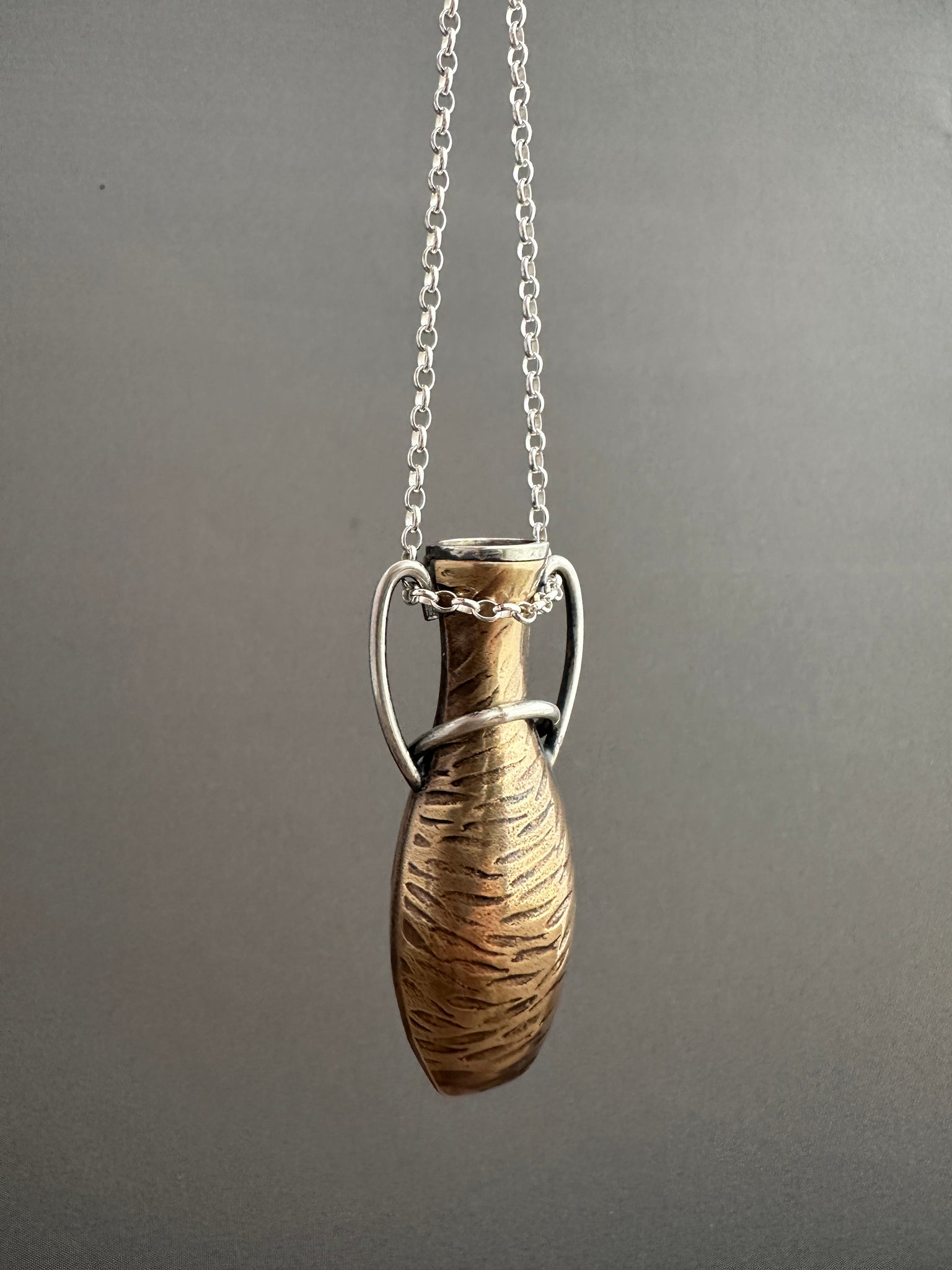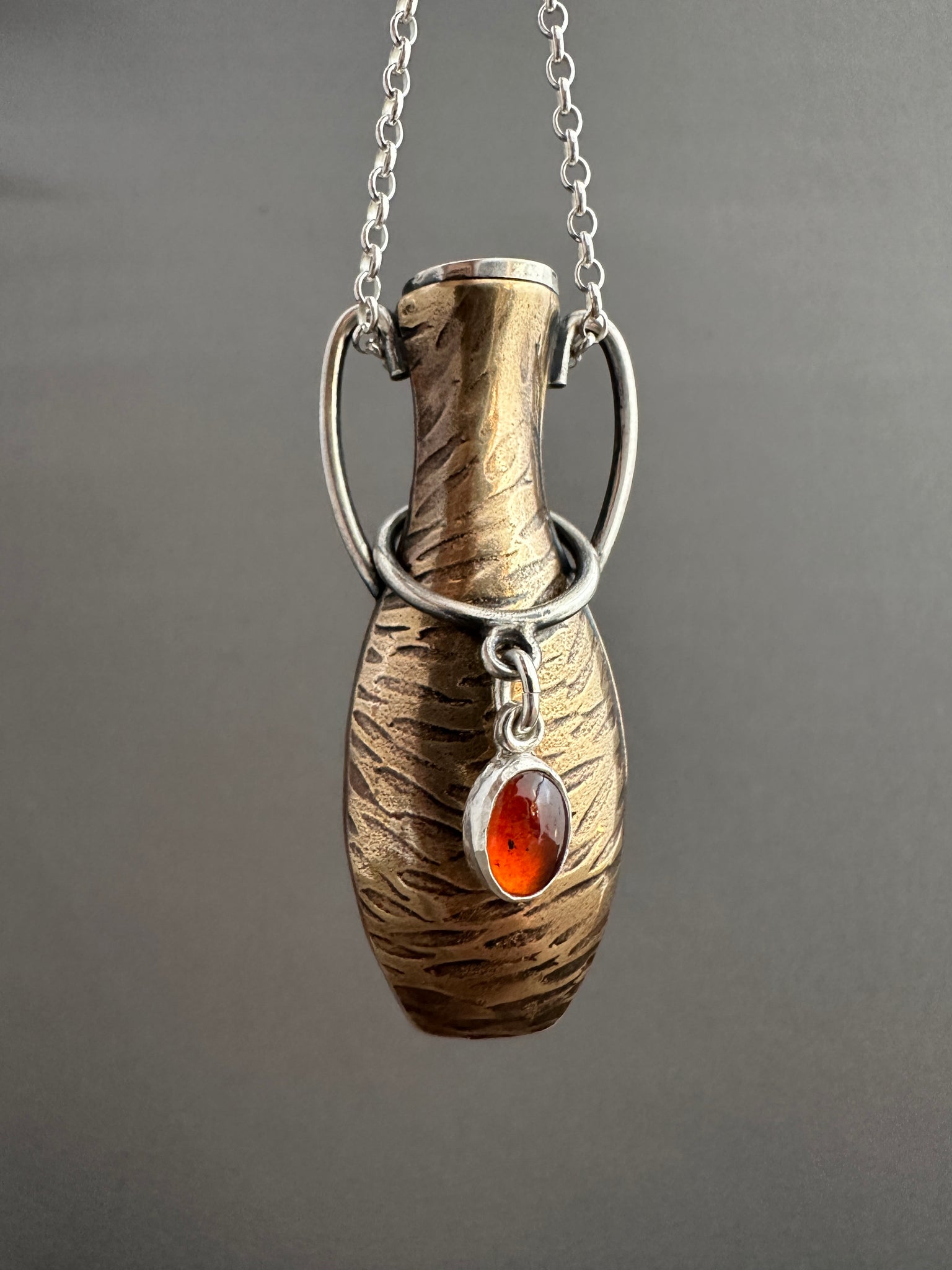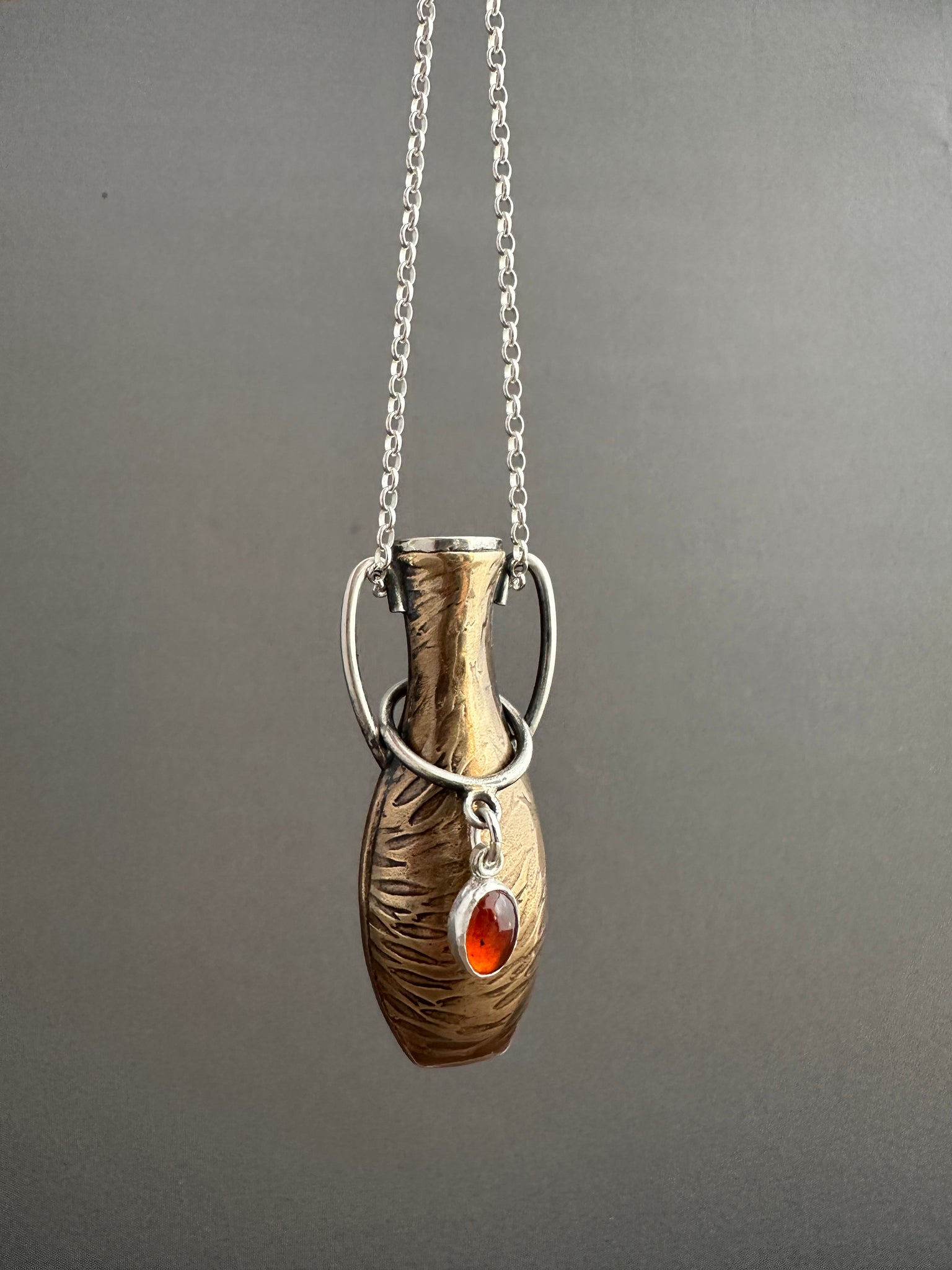 The Amphora was made with patina’d brass, sterling silver, and garnet.
