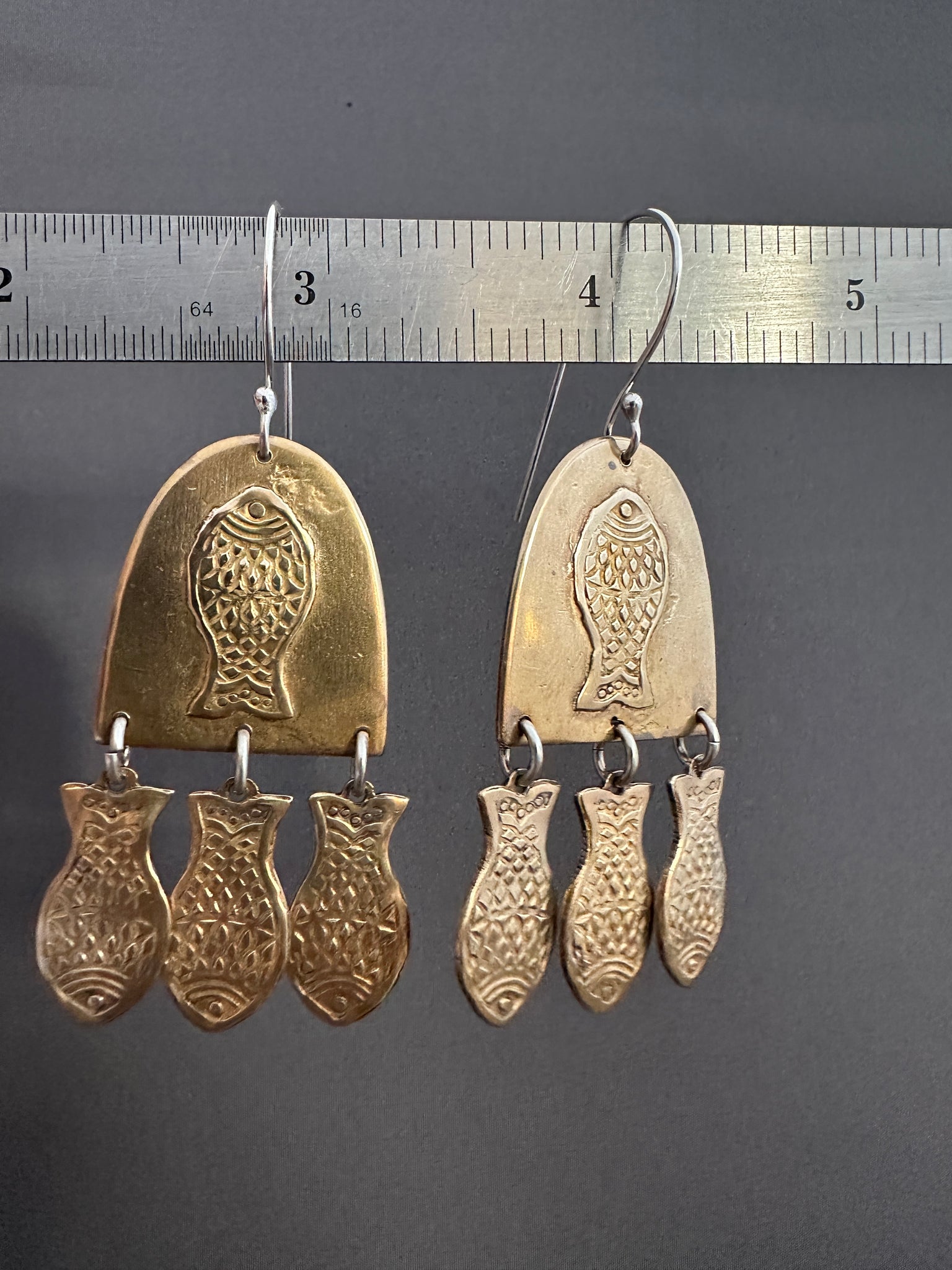 These earrings are made with brass that’s been hammered and Pressed by hand to create each element.