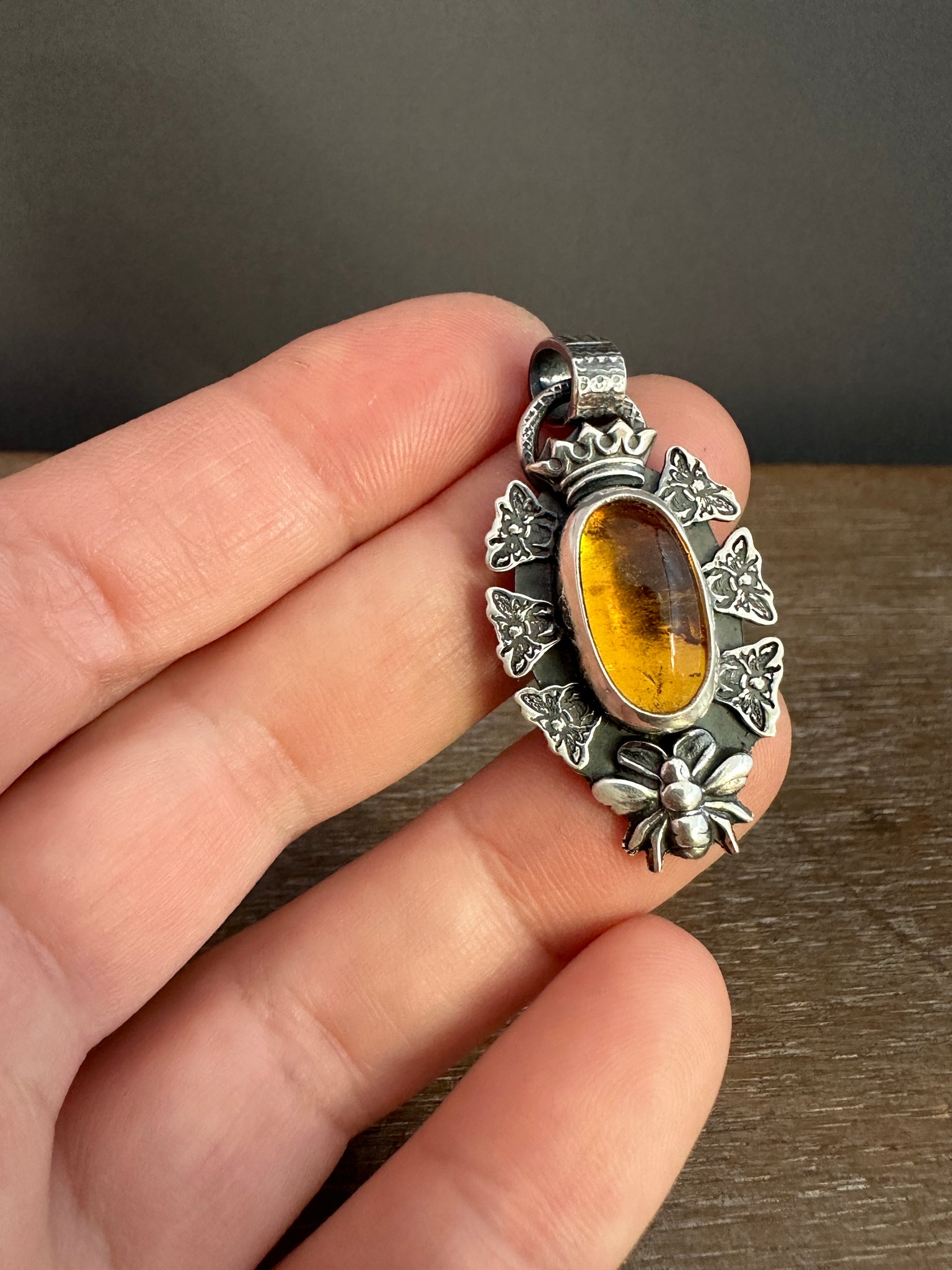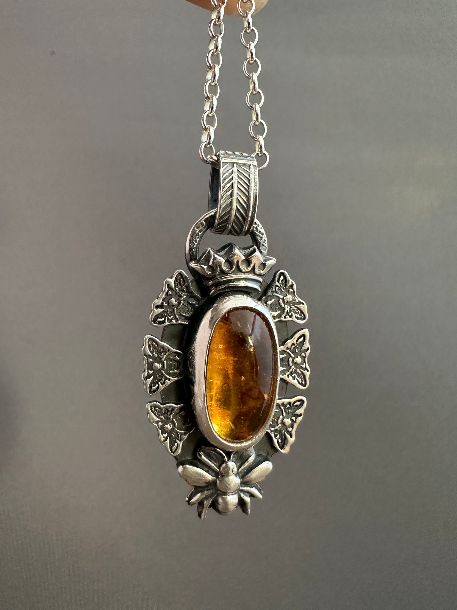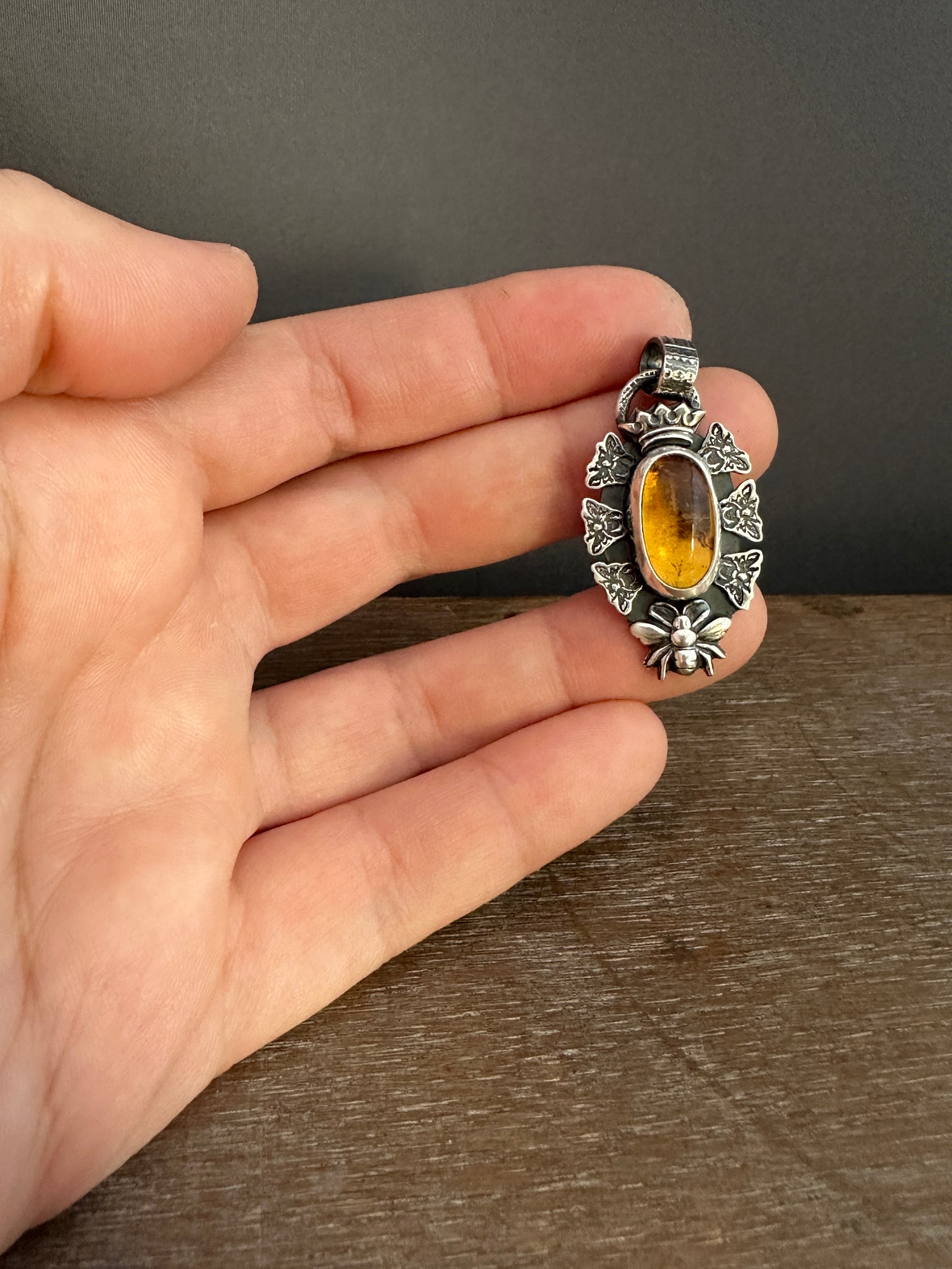 Bees dancing around a crowned honey colored quartz, set in sterling silver.