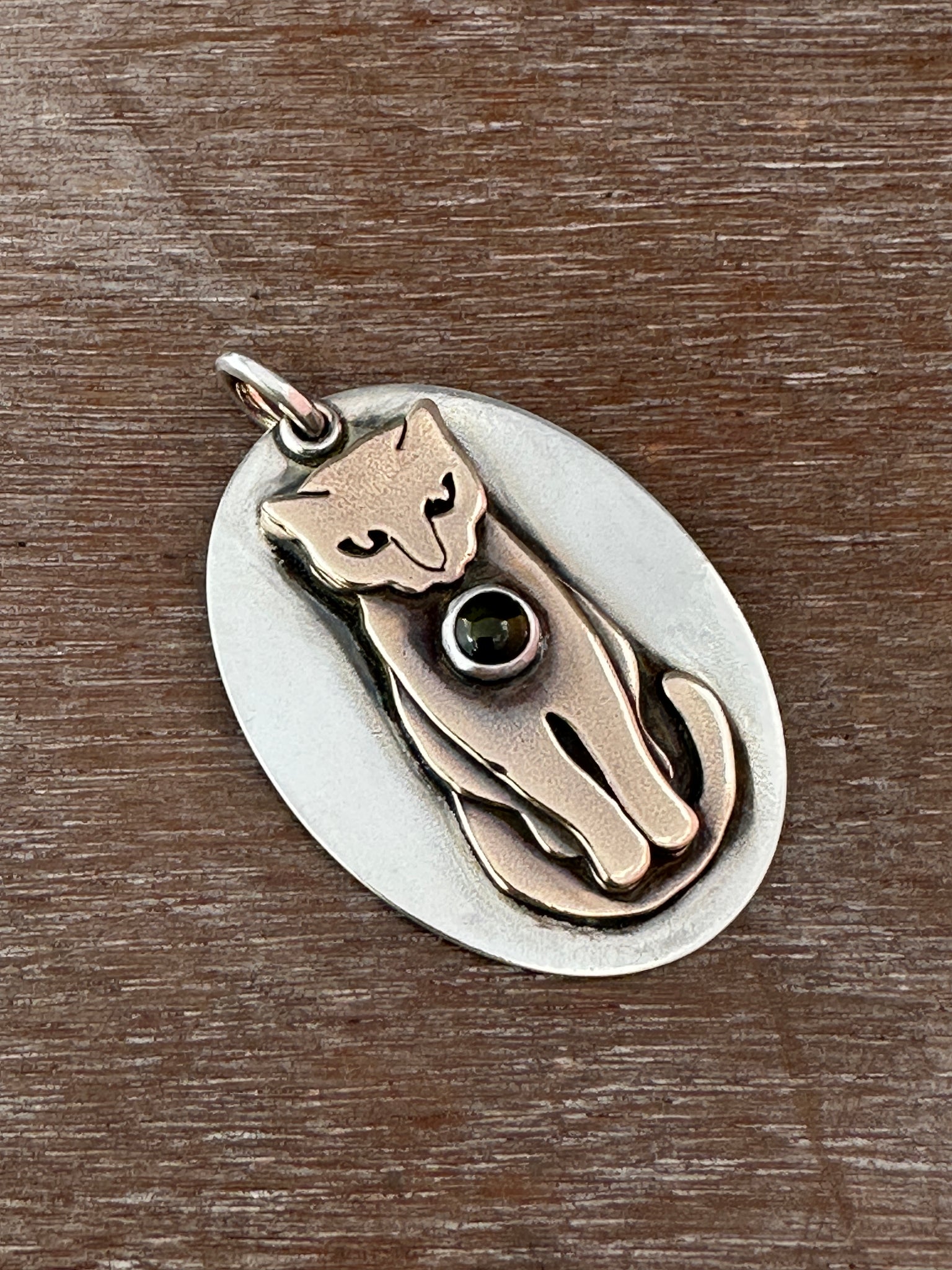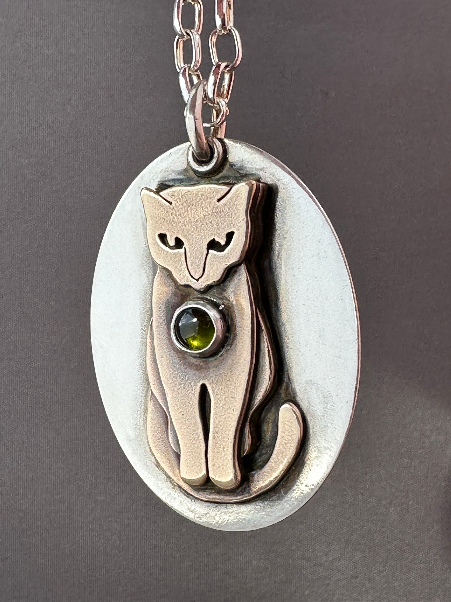 They are all adorned with unique stones, this cat has a beautiful dark green tourmaline.