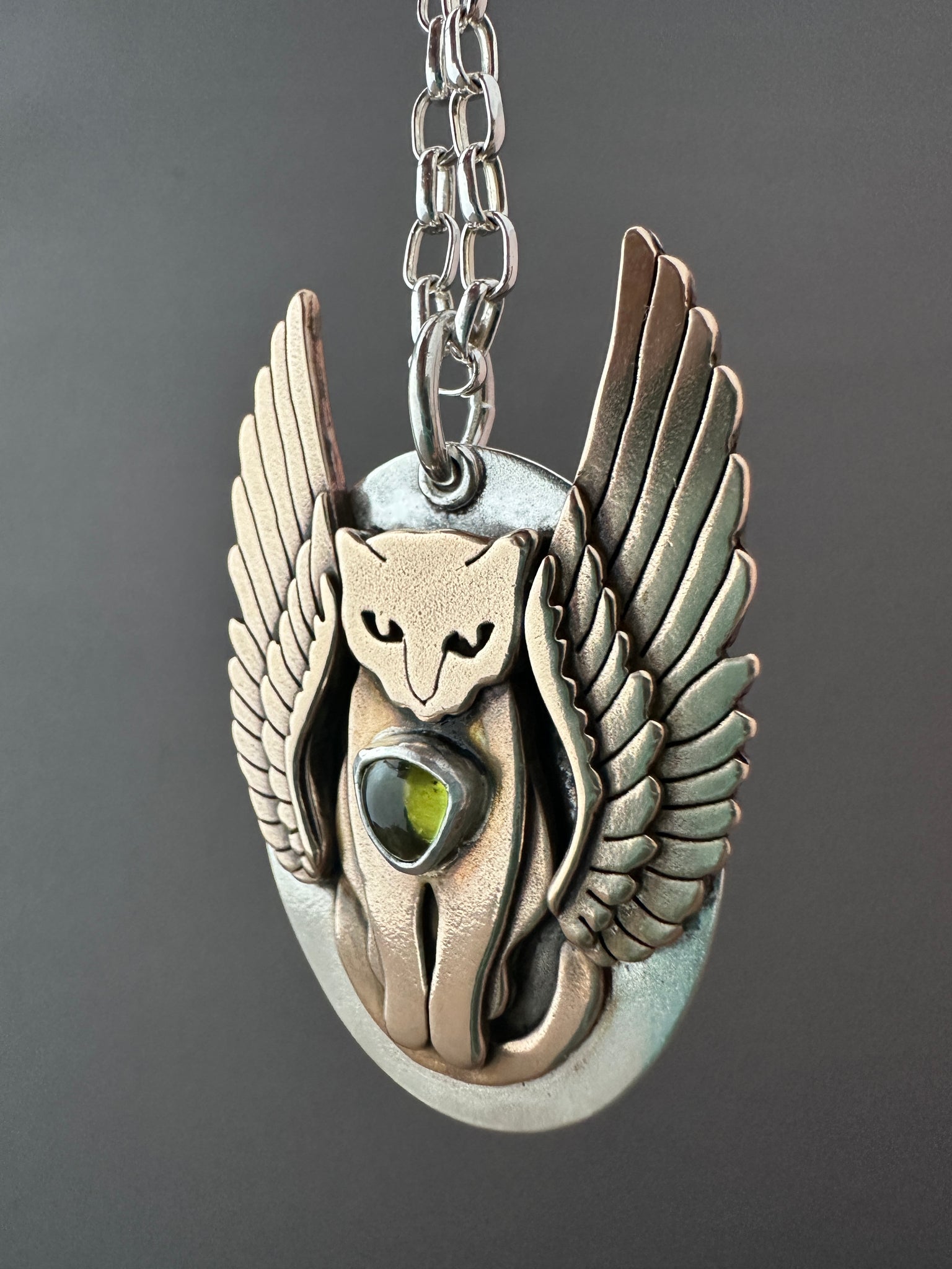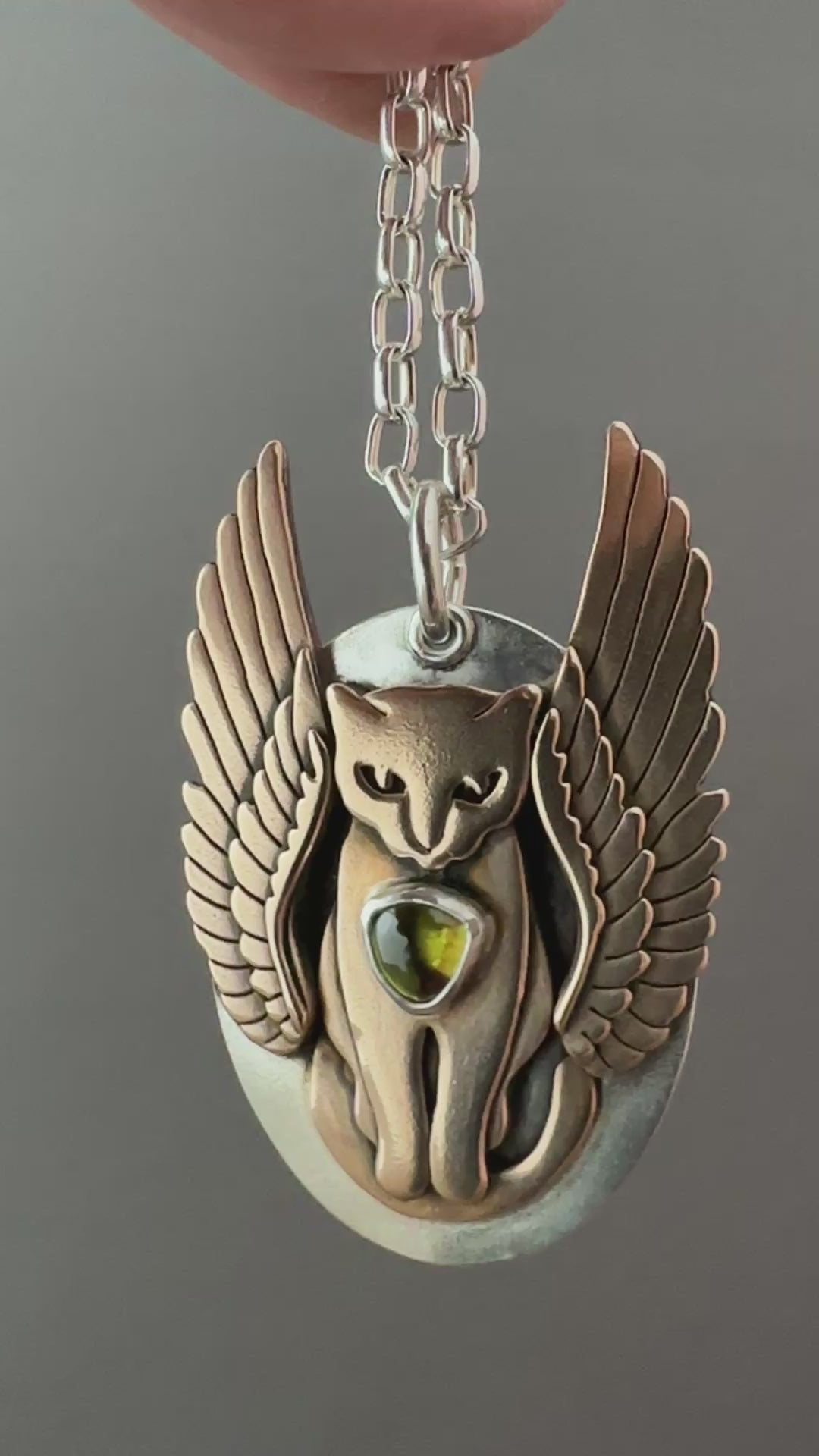 They are all adorned with unique stones, this kitty has a lovely green peridot.