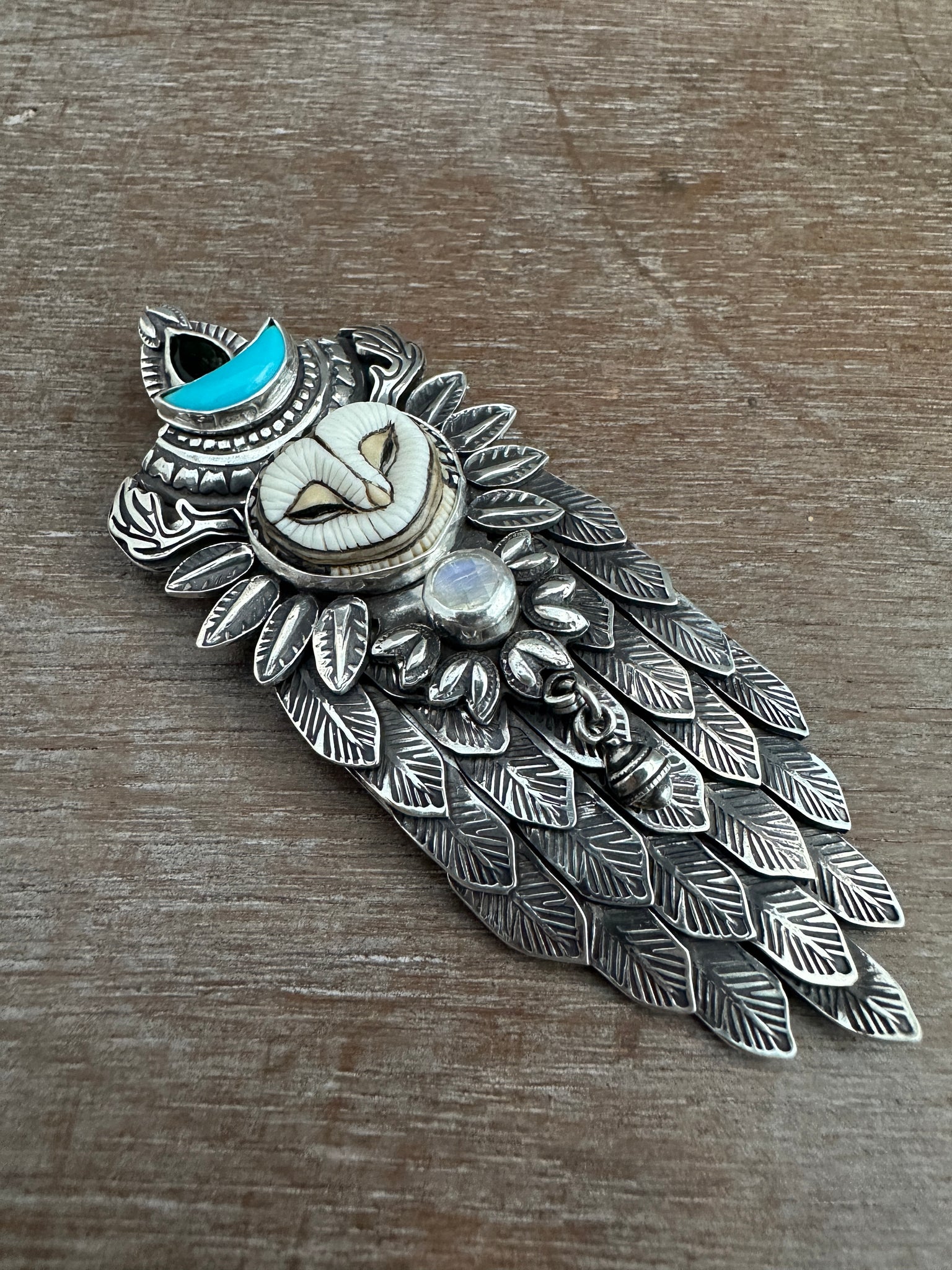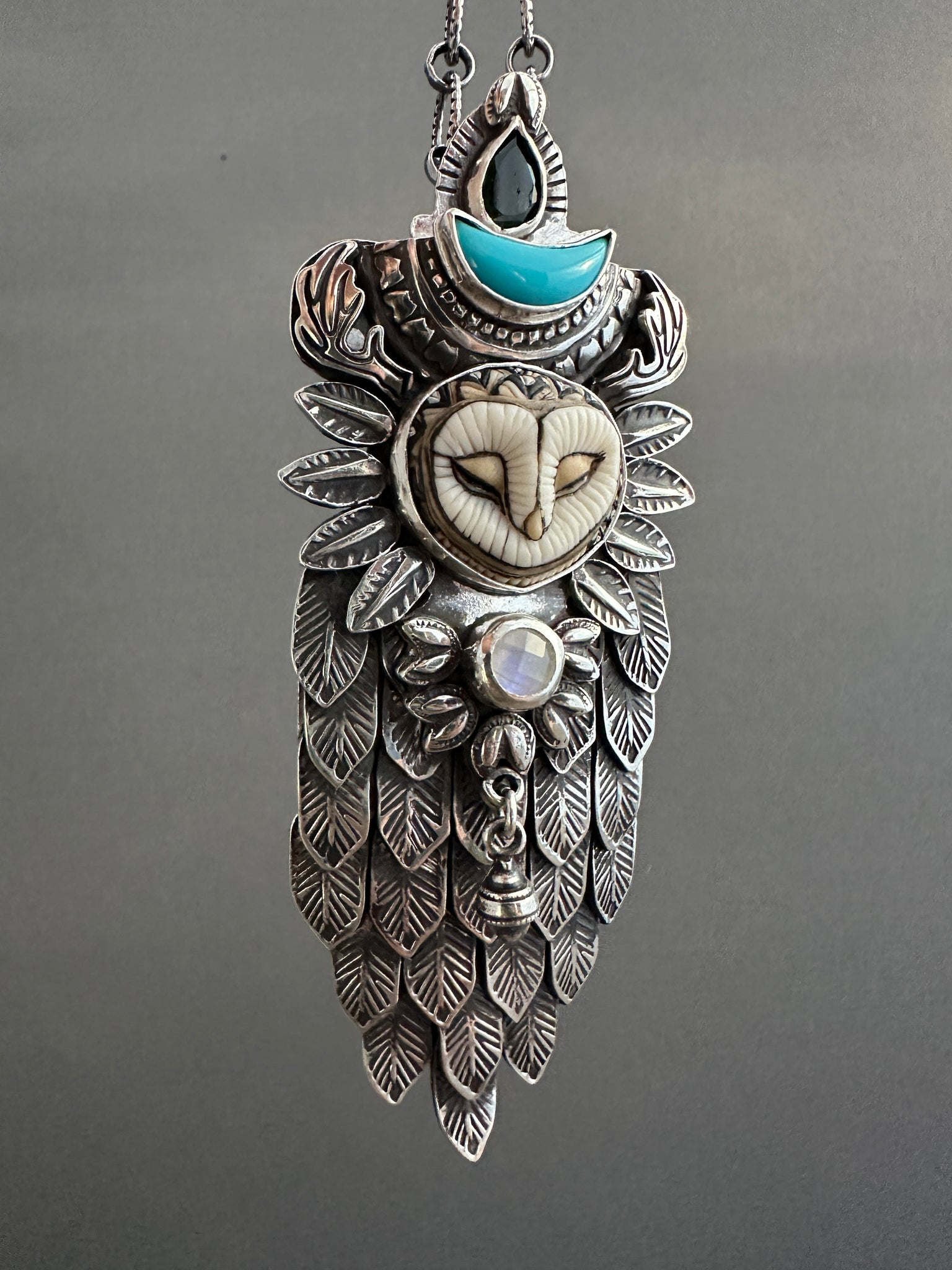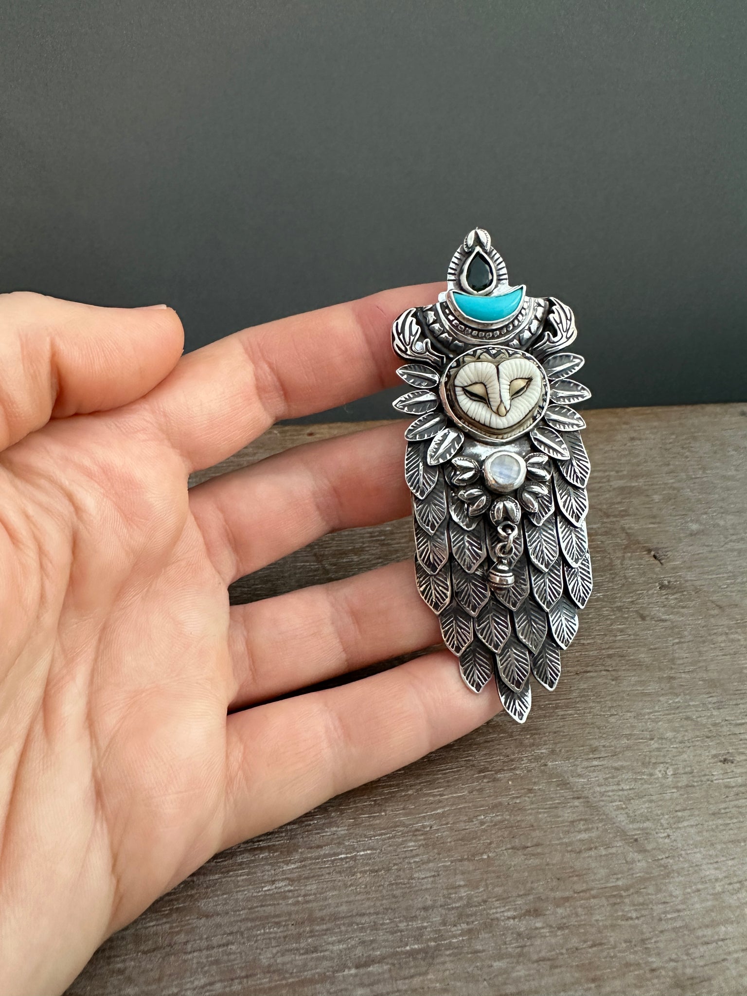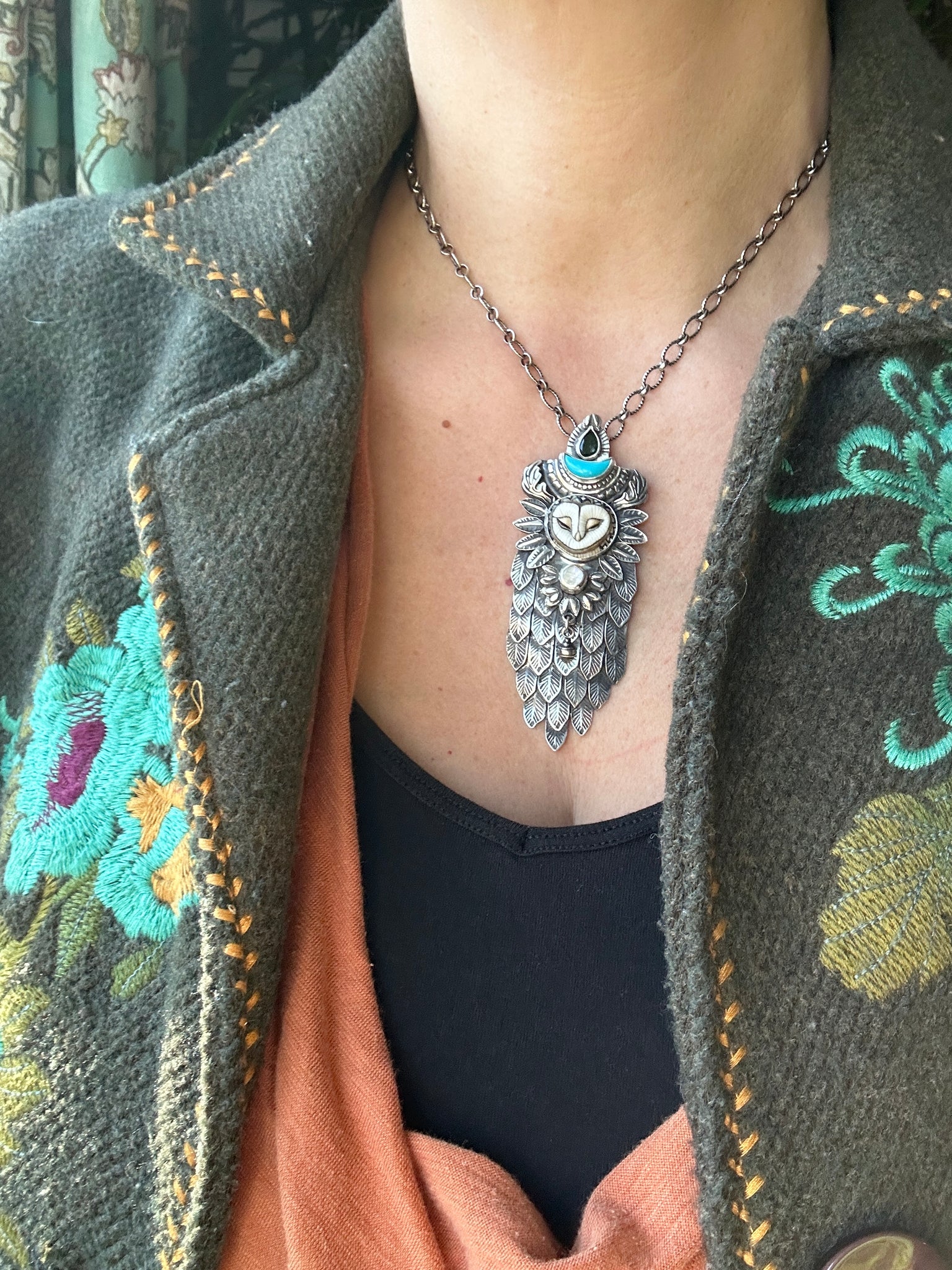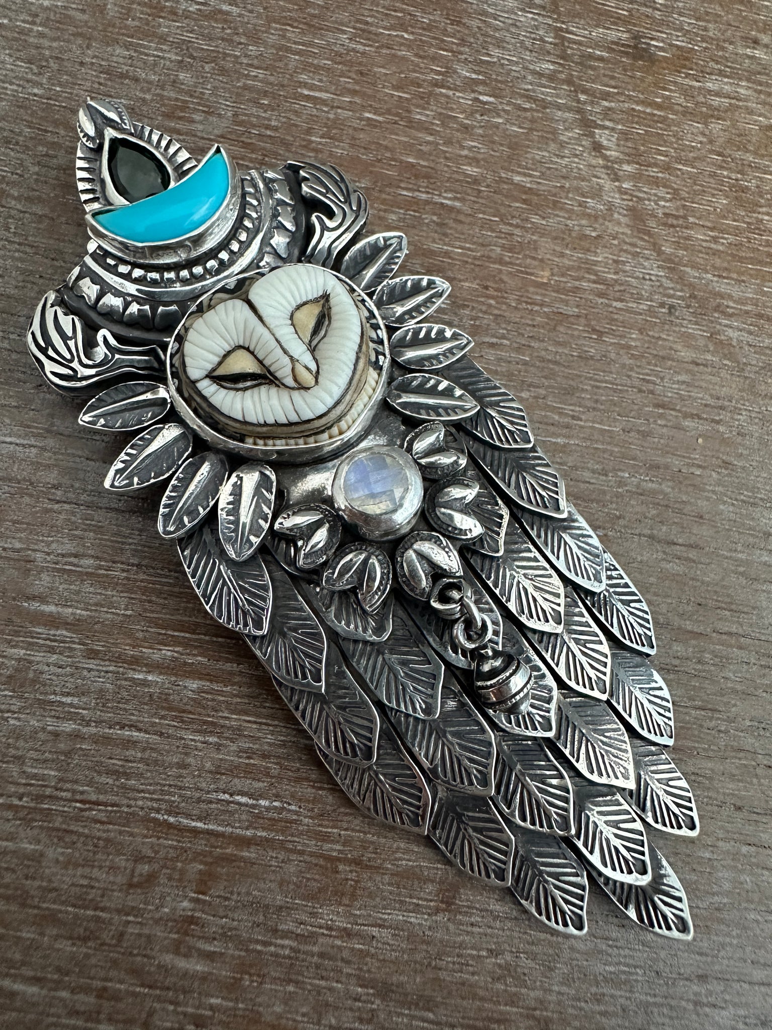 I made her into a bejeweled owl Queen, wearing a moonstone necklace, and a crown of turquoise and tourmaline. She was created with many cut out stamped pieces on a slightly domed owl body. Each one was created by hand, nothing is prefabricated.