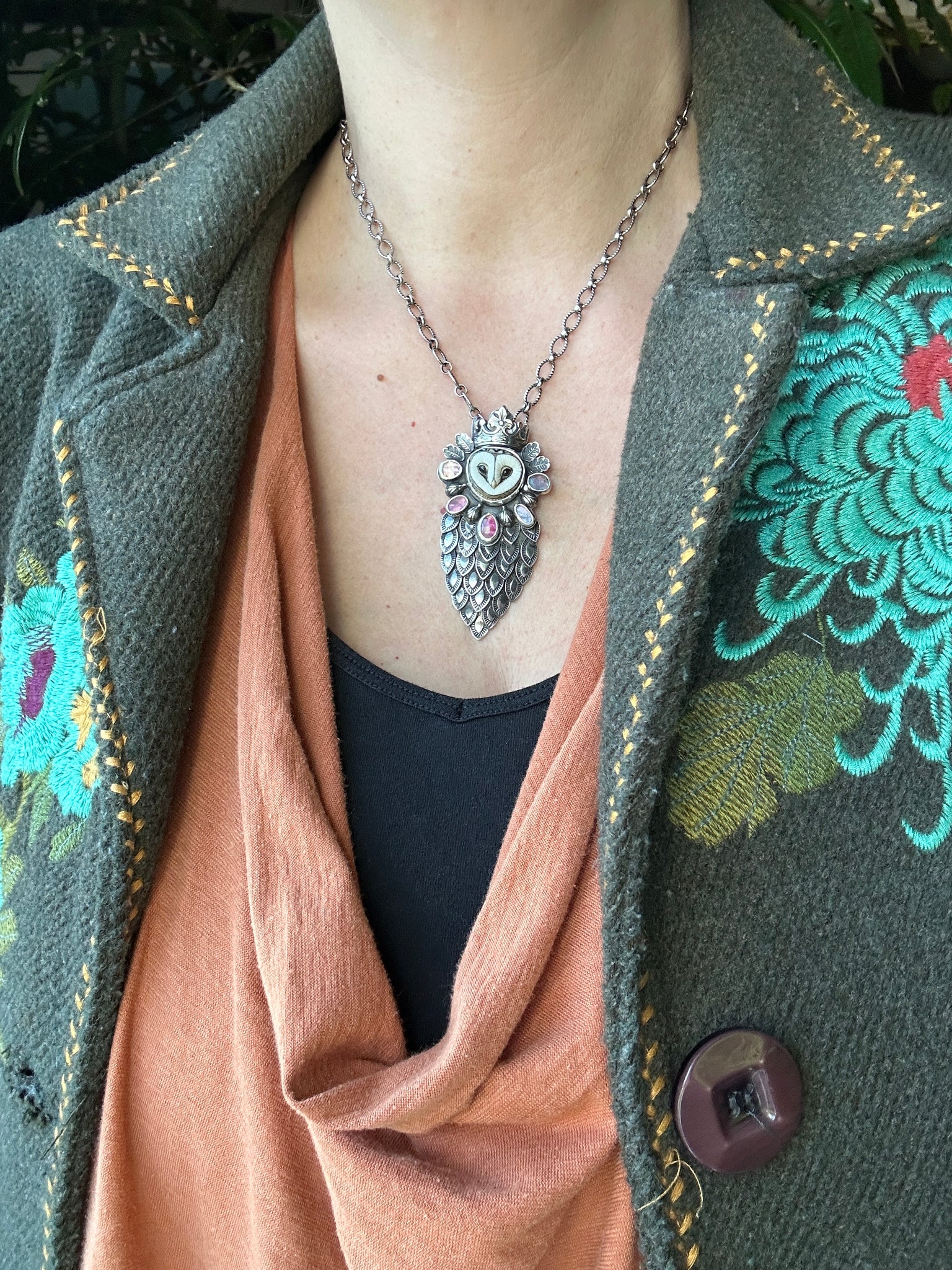 I made her into a bejeweled owl Queen, with a pink tourmaline necklace.   She was created with many cut out stamped pieces on a slightly domed owl body.  Each one was created by hand, nothing is prefabricated.