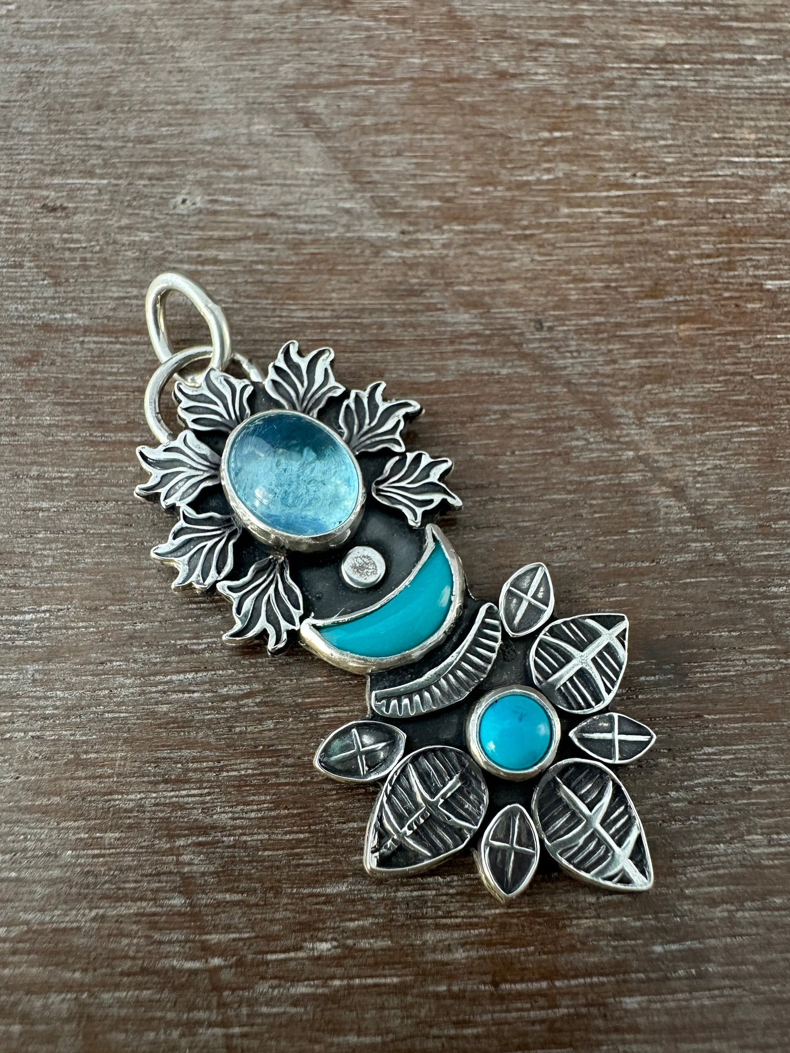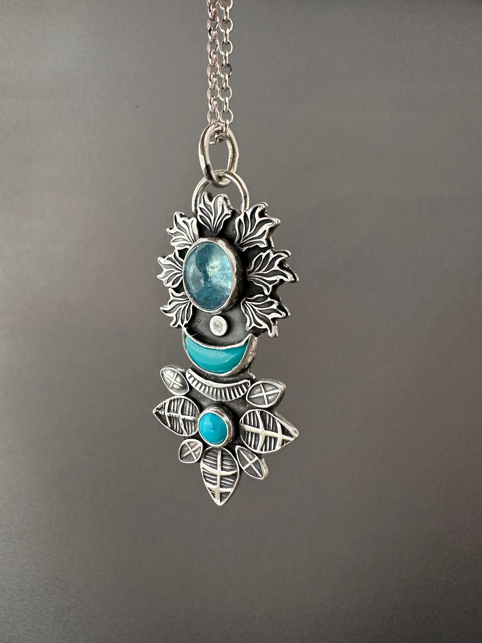 A beautiful glowing Aquamarine, is set within a circle of flames, creating a contrast of icy and hot. A turquoise moon, and cab sit below, and are surrounded by leaves.