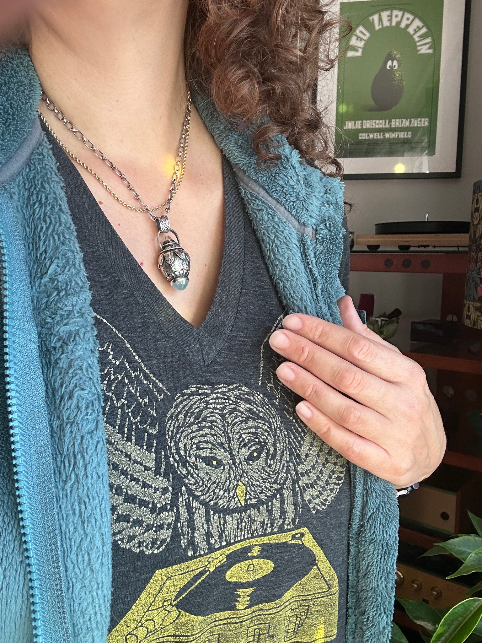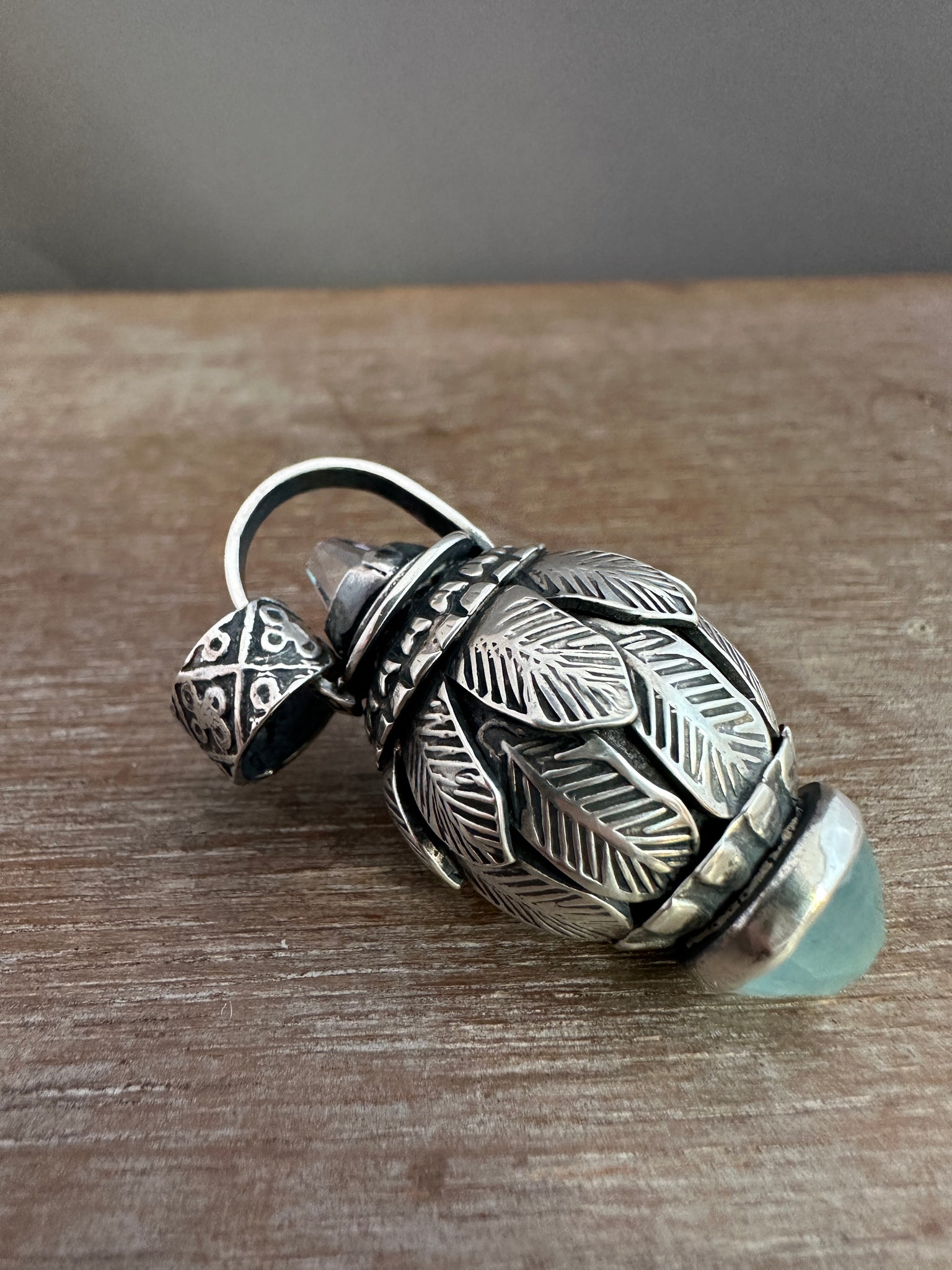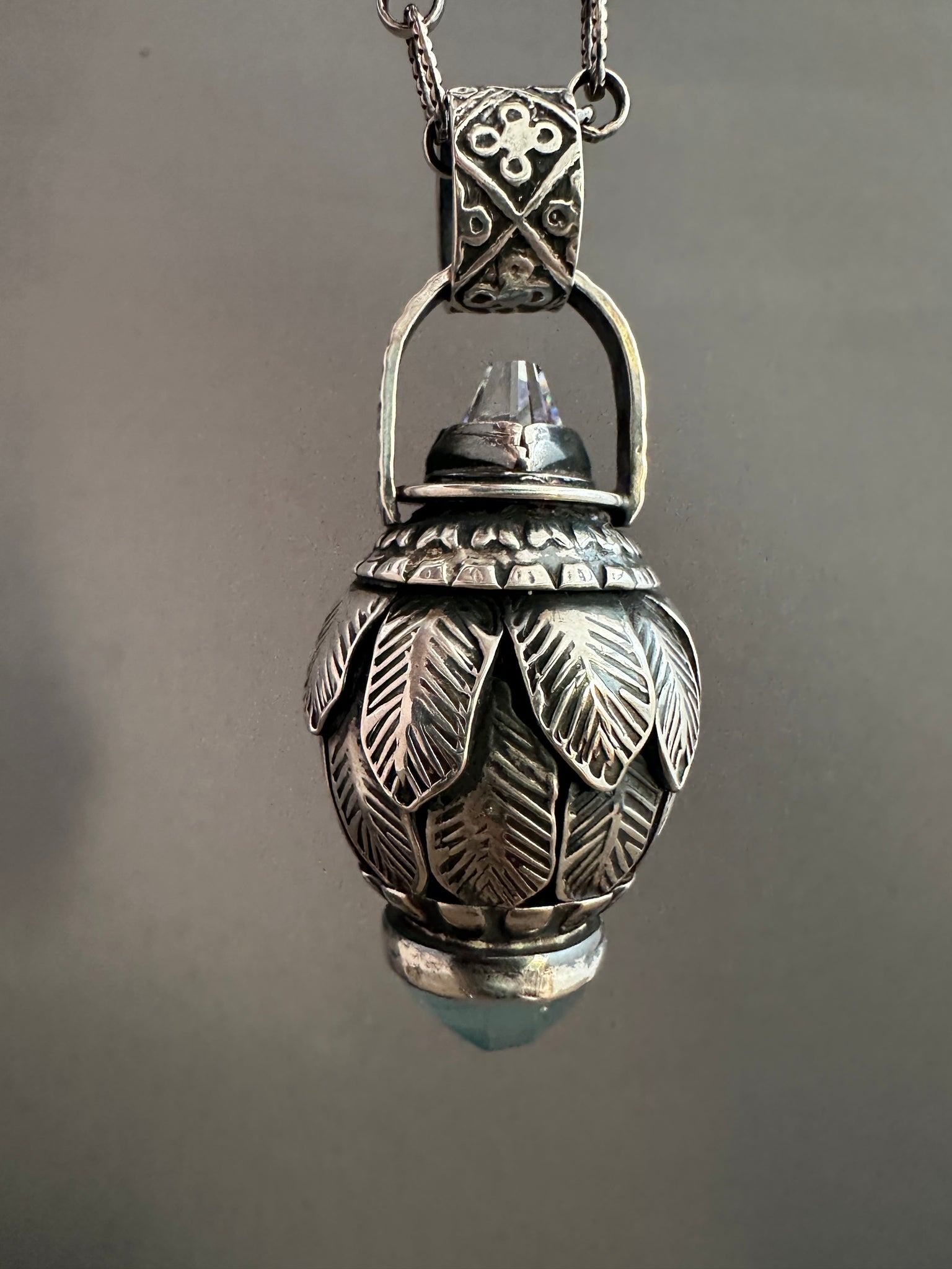 This is a unique piece that I only create every few years because of its complexity. Several hand stamped pieces are cut out an applied to a sphere. Unique stones are set on the top and bottom. Decorative wire is applied to add tiny details.