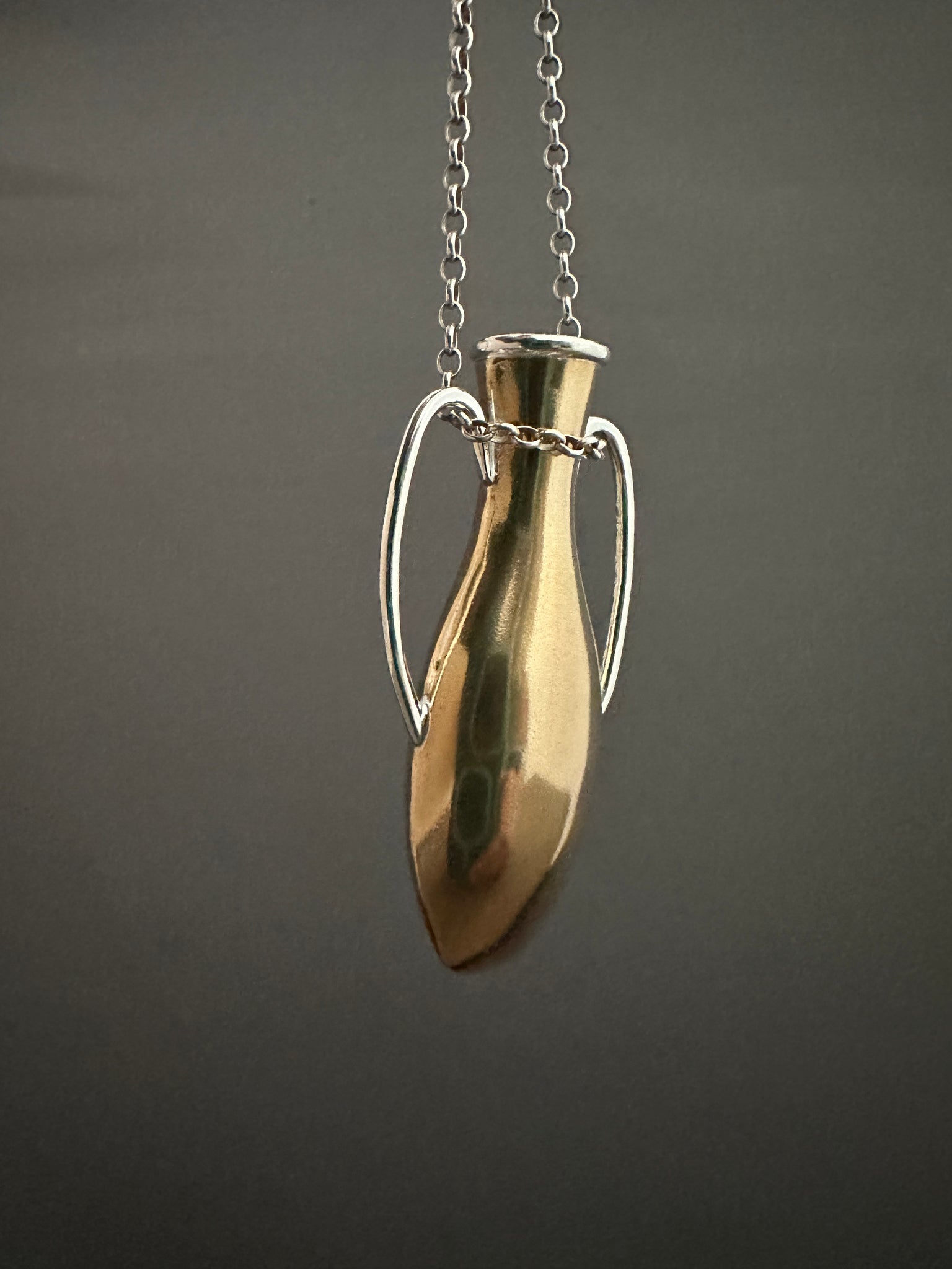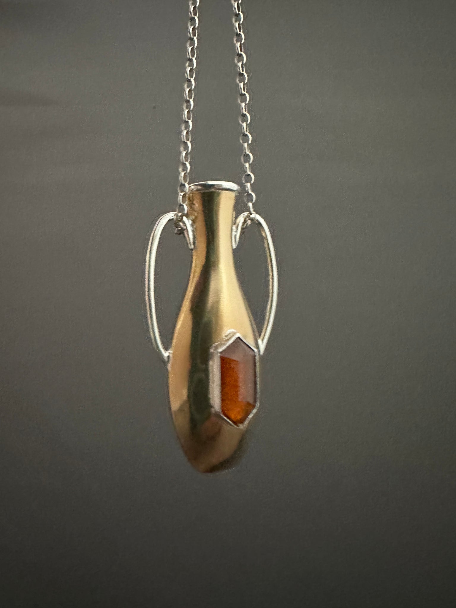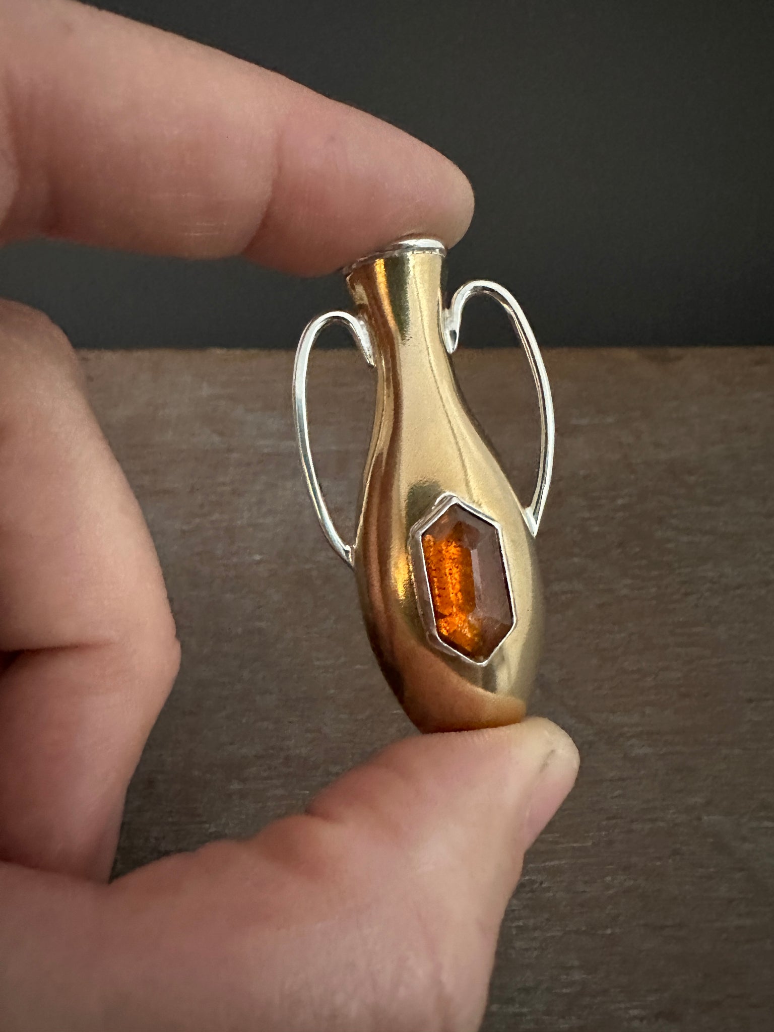 This Amphora was hand fabricated from brass and sterling silver with an orange kyanite on the front.