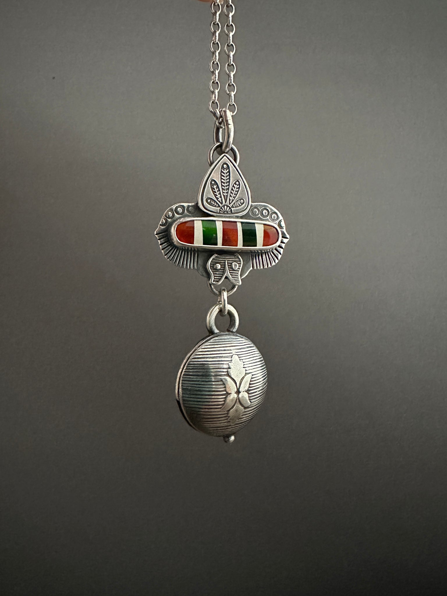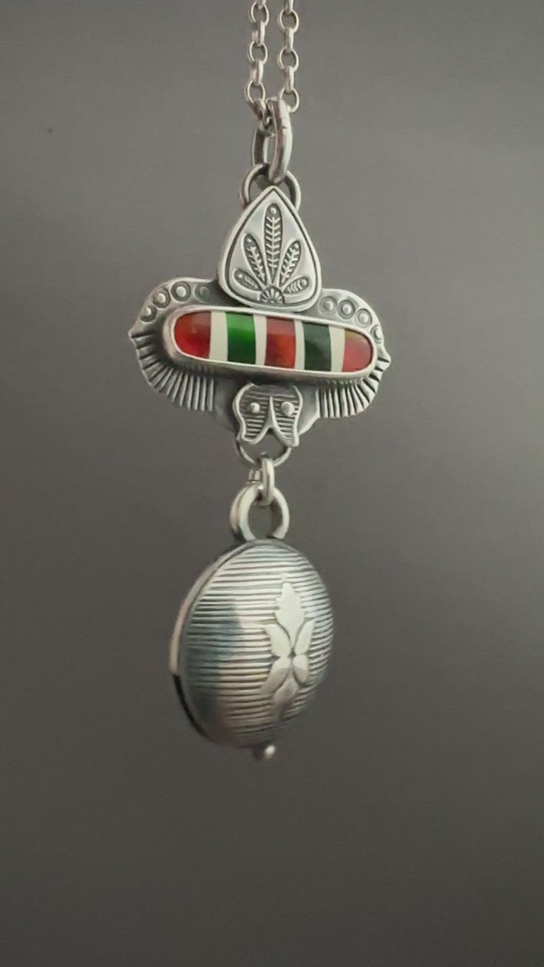 This piece is completely handmade from sterling silver. The elaborate Jingle Bell was completely hand fabricated. At the top of the bell is candy cane cab set in sterling silver. The candy cane was handmade by another artisan, these were created from a man made Opal material and put together with a technique called intarsia, creating a candy cane effect.