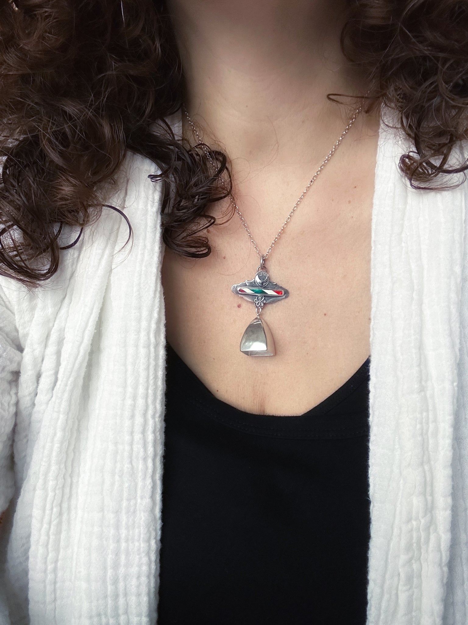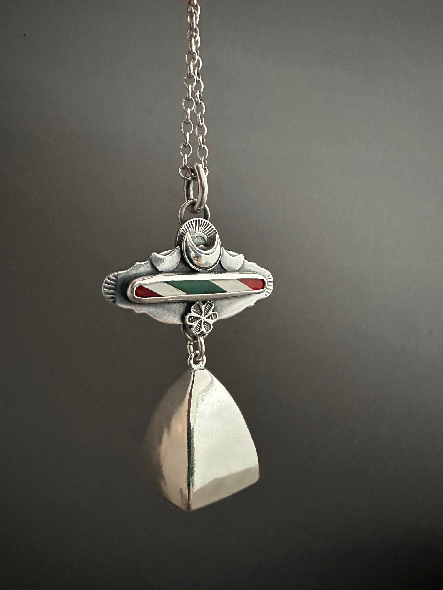 This piece is completely handmade from sterling silver. The bell is completely handmade. At the top of the bell is candy cane cab set in sterling silver. The candy cane was handmade by another artisan, these were created from a man made Opal material and put together with a technique called intarsia, creating a candy cane effect.