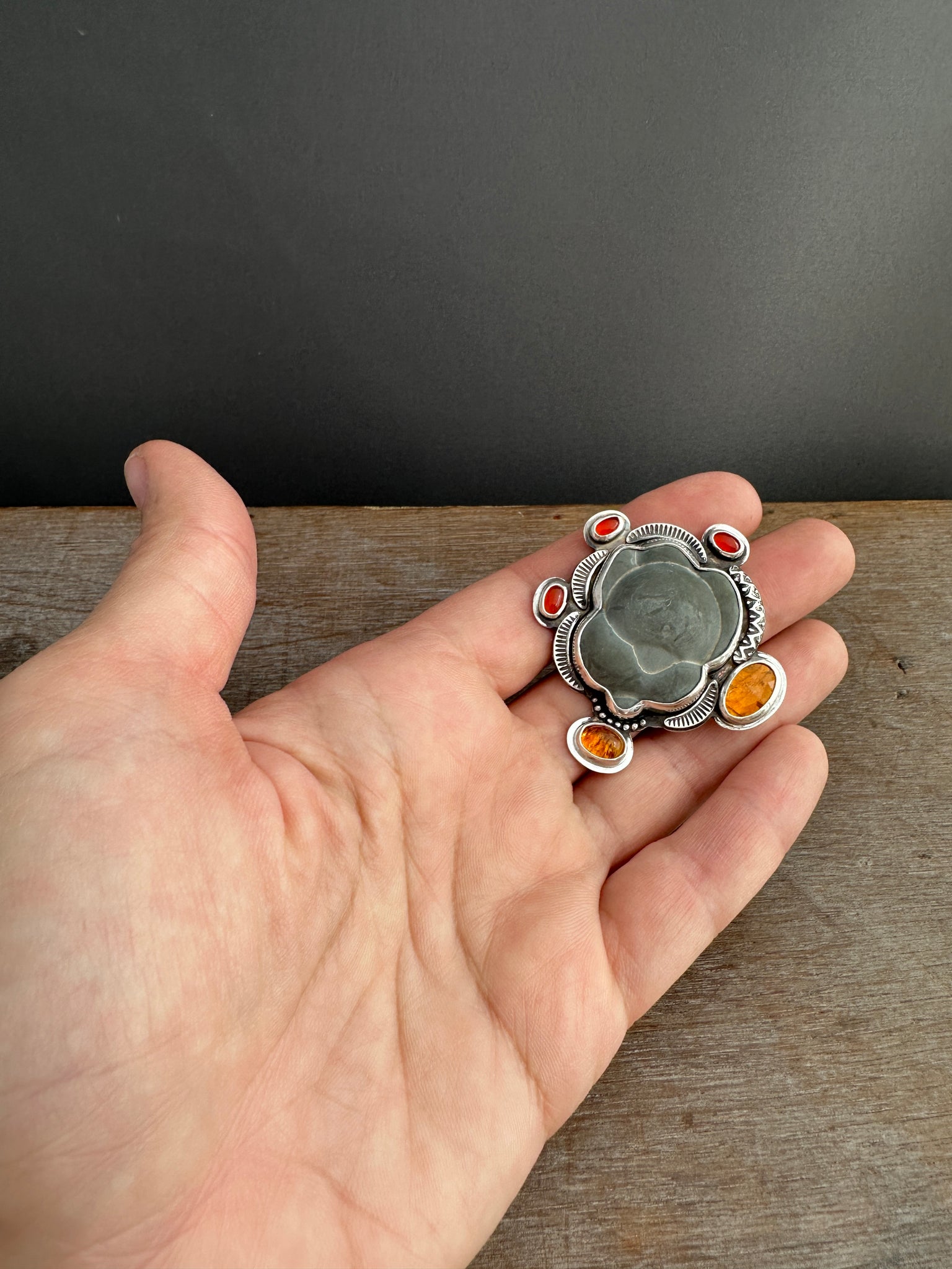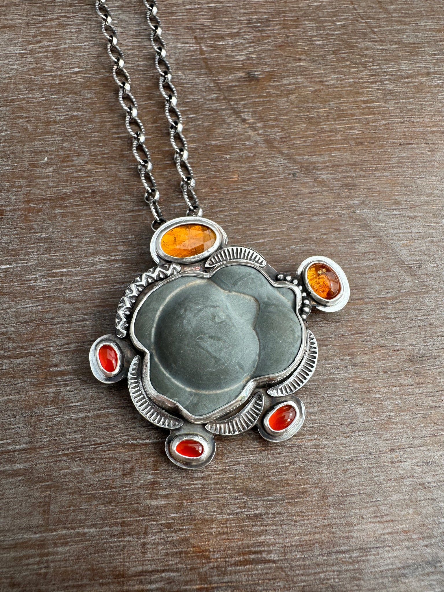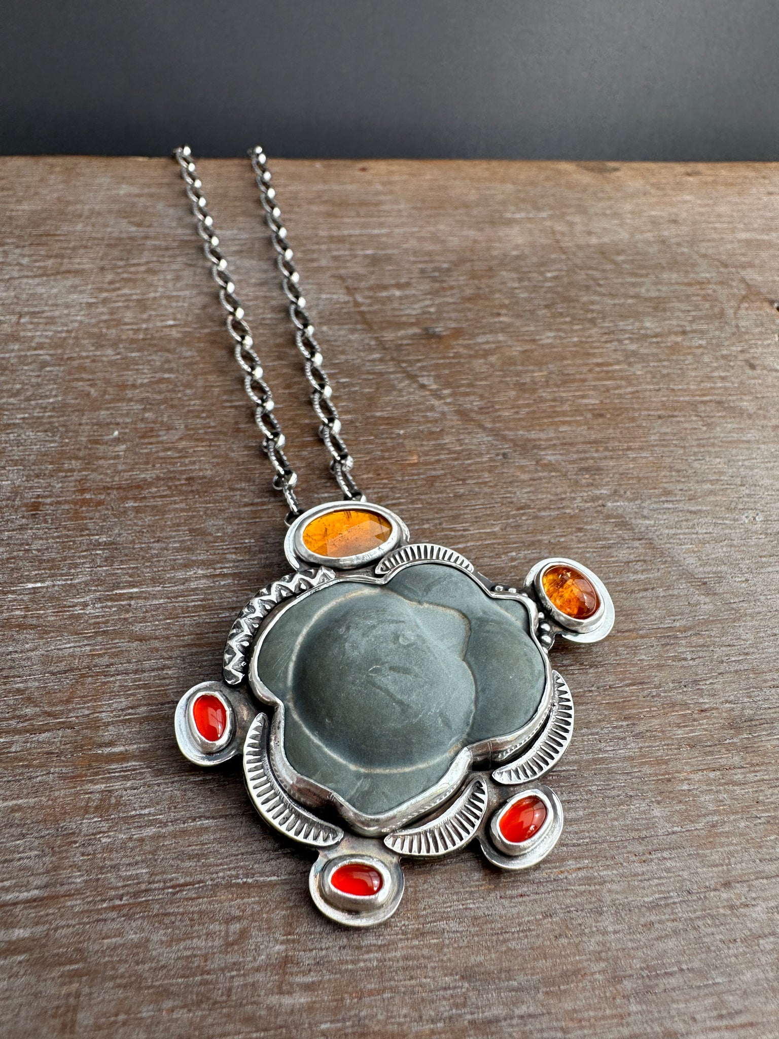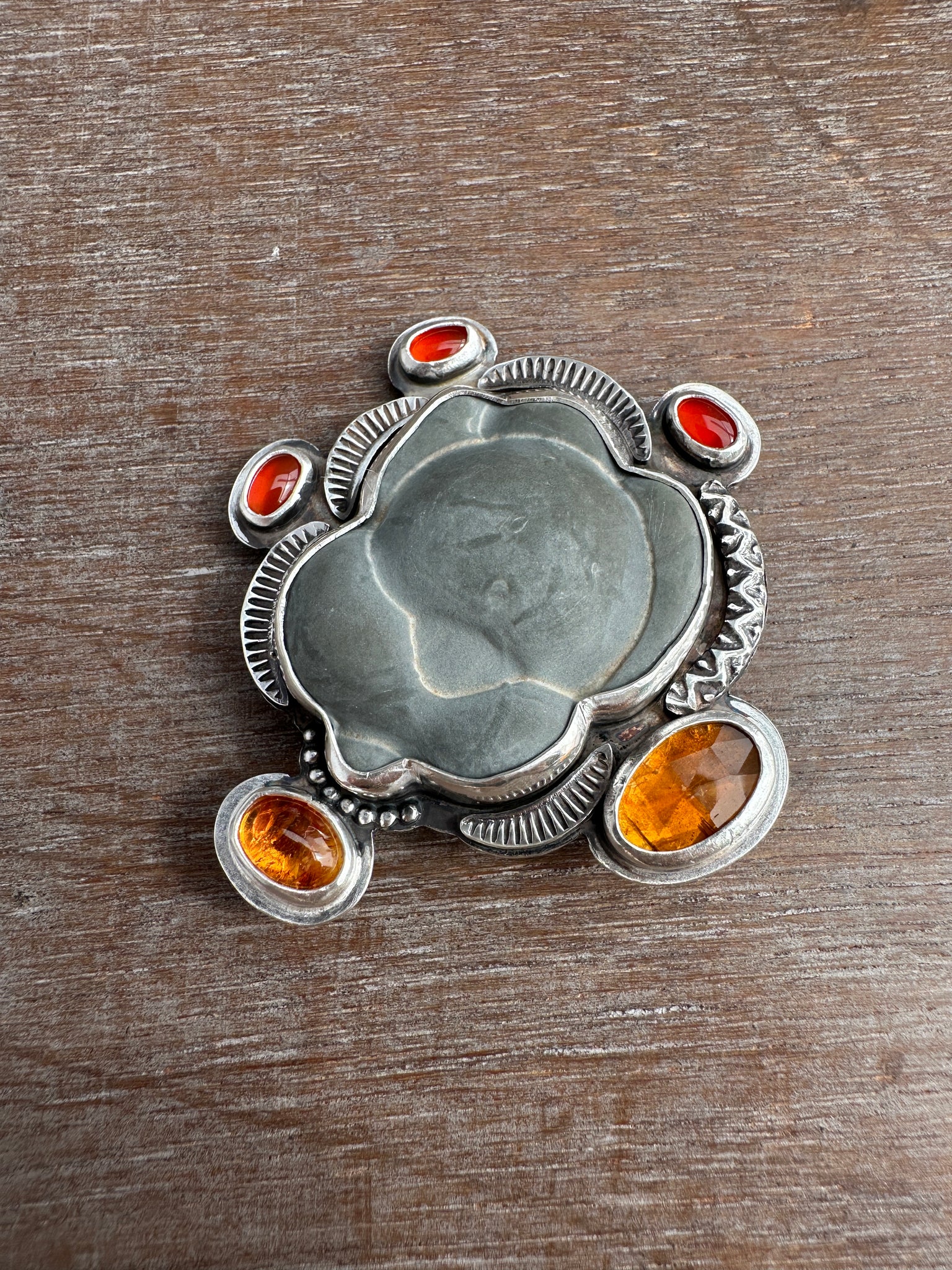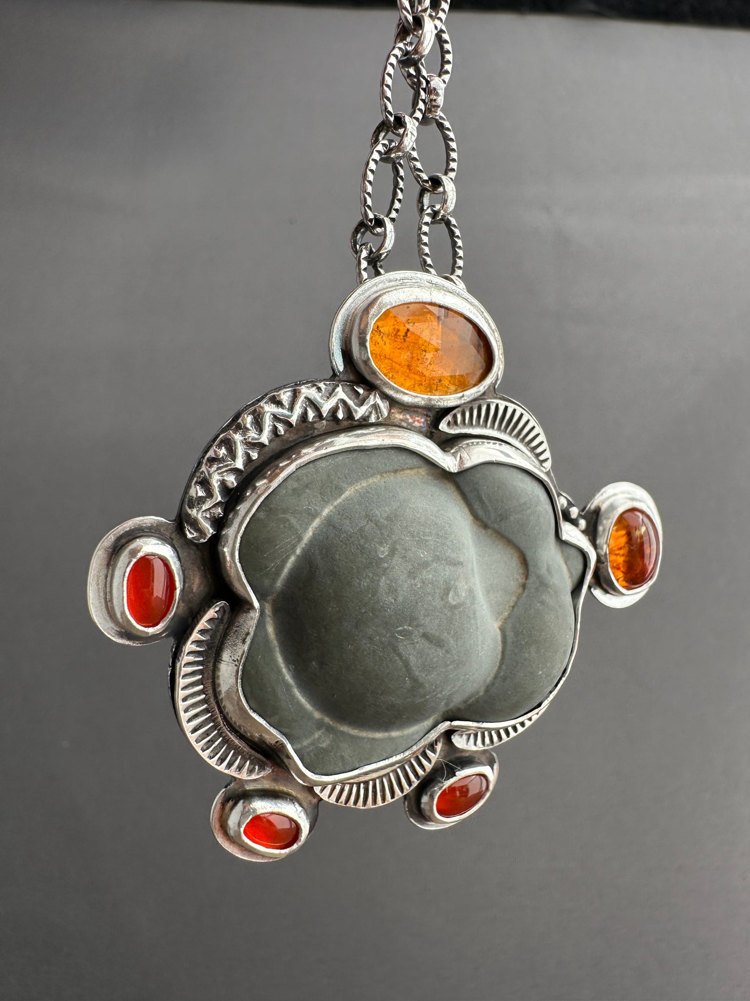 A fairy stone is a naturally formed concretion (fossilized mud) These were collected in Quebec, Canada. I’ve paired each of these fairy stones with unique stones. This one is surrounded by 3 carnelian, an orange kyanite, and a mandarin citrine.