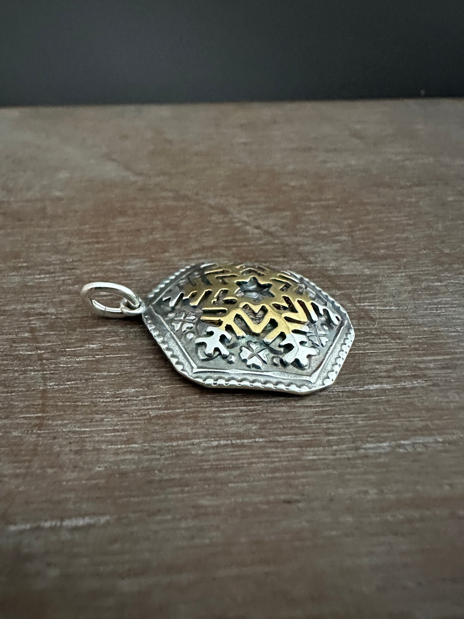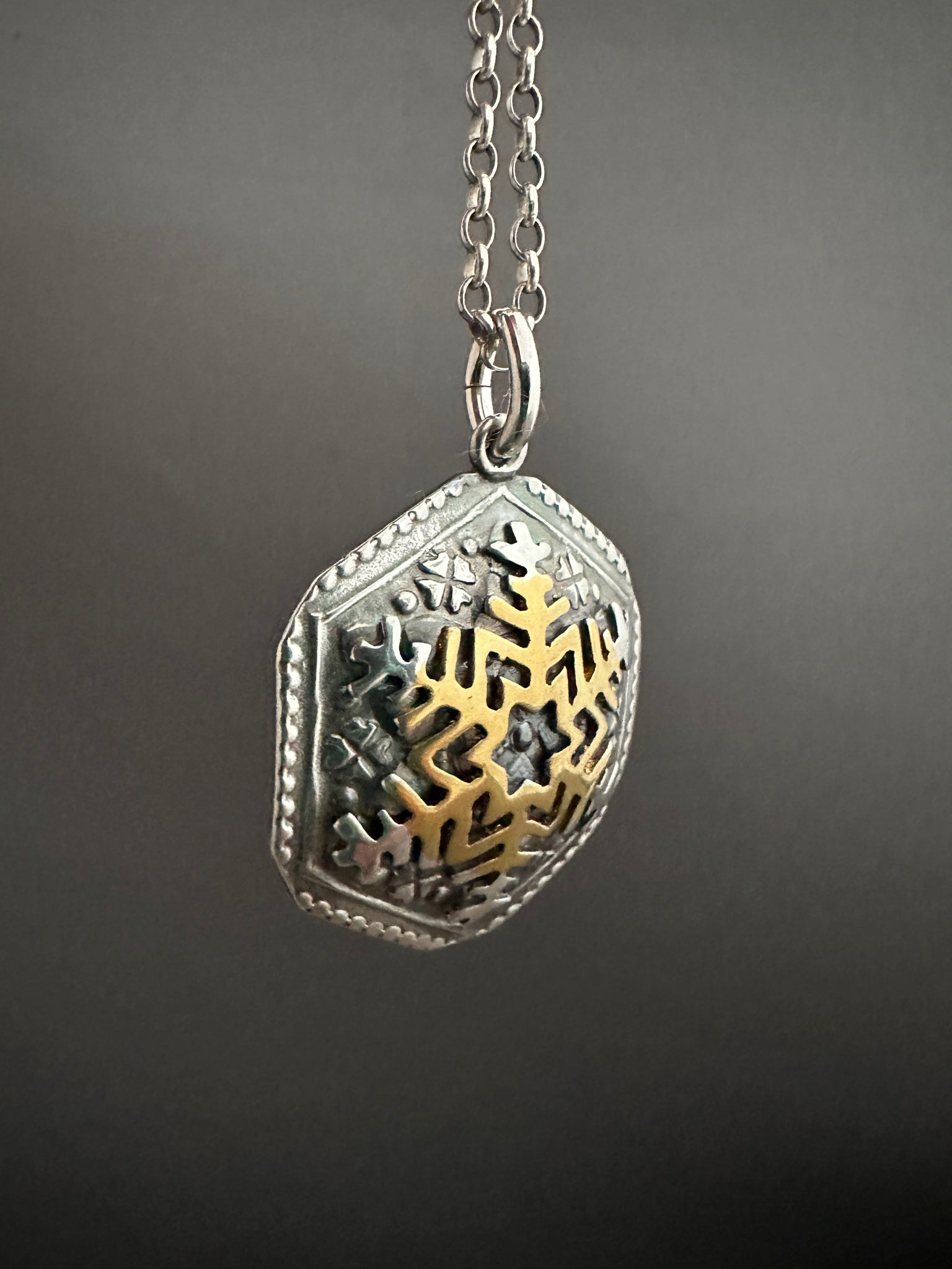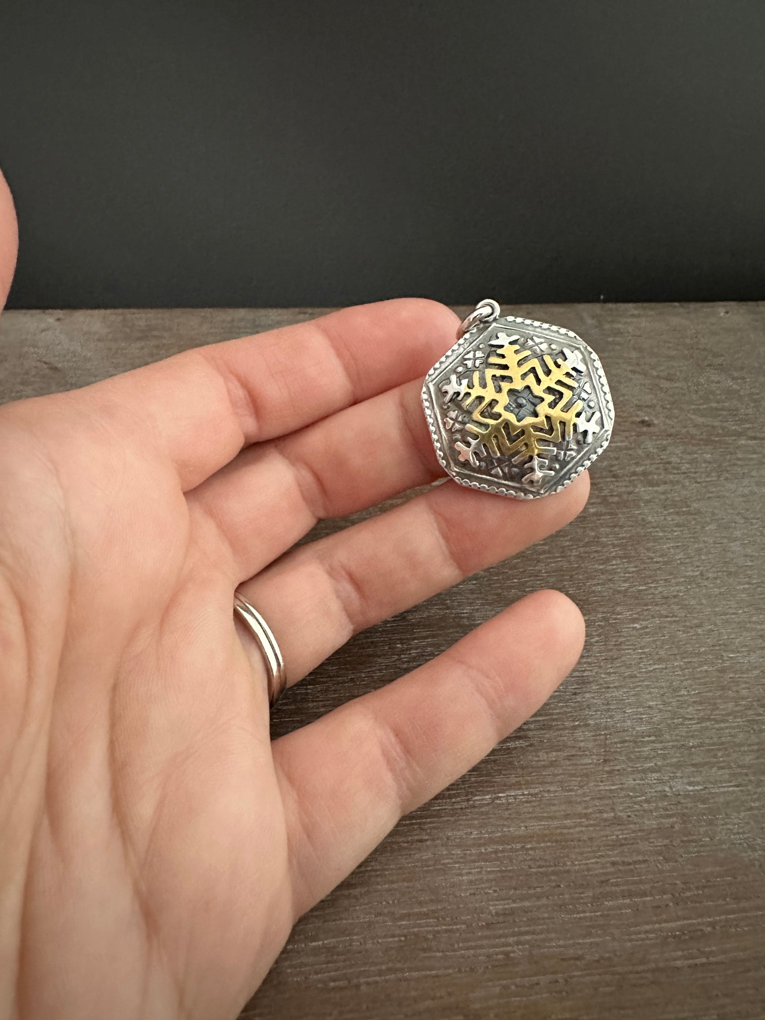 This piece is completely handmade from sterling silver and 23k gold foil. The elaborate snowflake was hand cut, and another layer of textured silver was added to give it dimension, a touch of gold foil was fused to the snowflake.