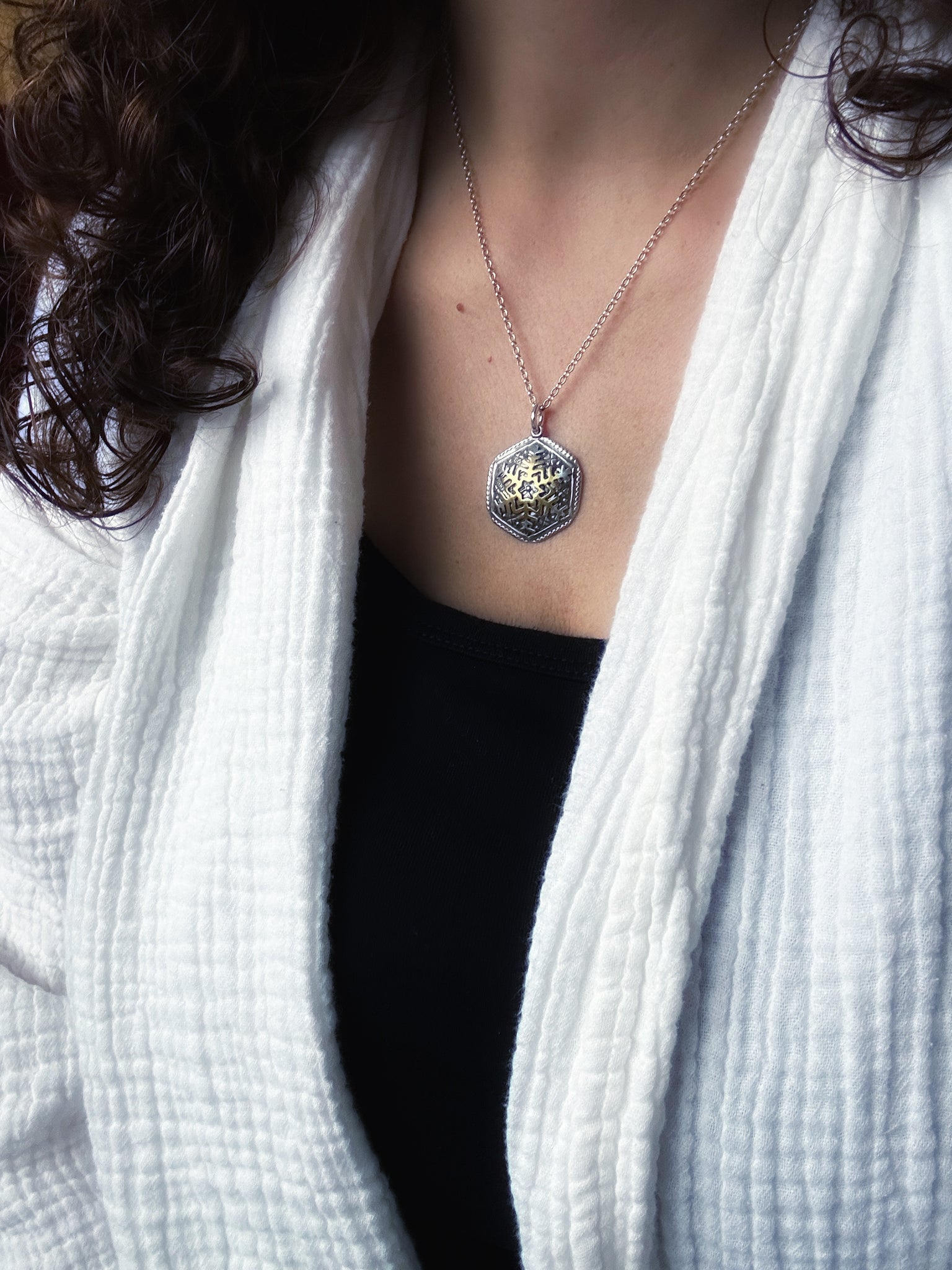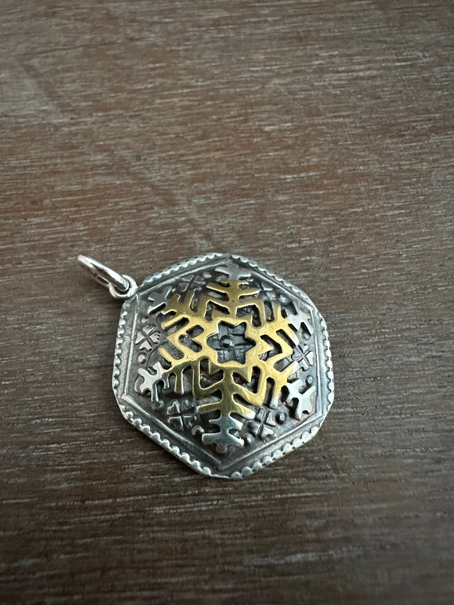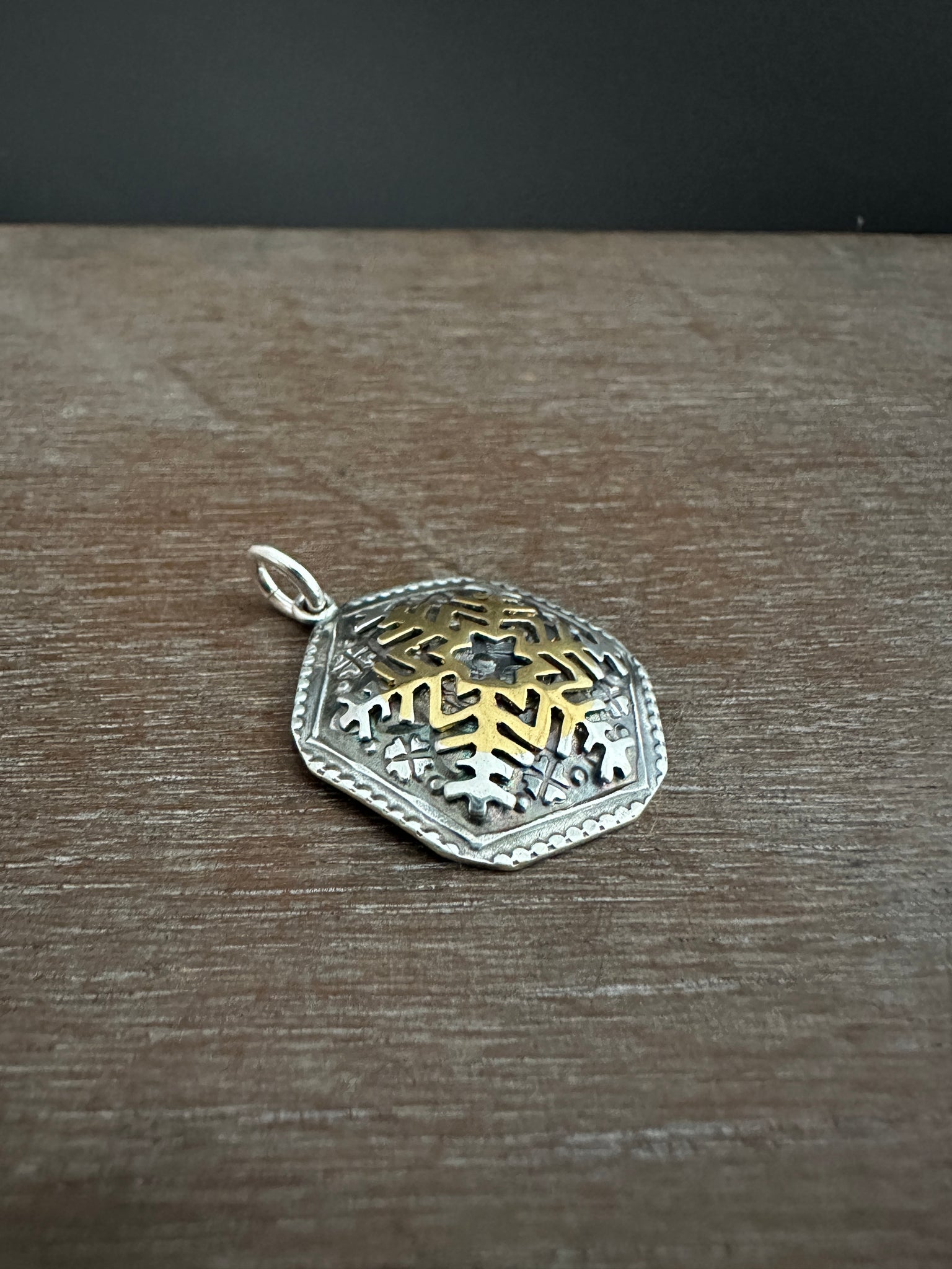 This piece is completely handmade from sterling silver and 23k gold foil. The elaborate snowflake was hand cut, and another layer of textured silver was added to give it dimension, a touch of gold foil was fused to the snowflake.