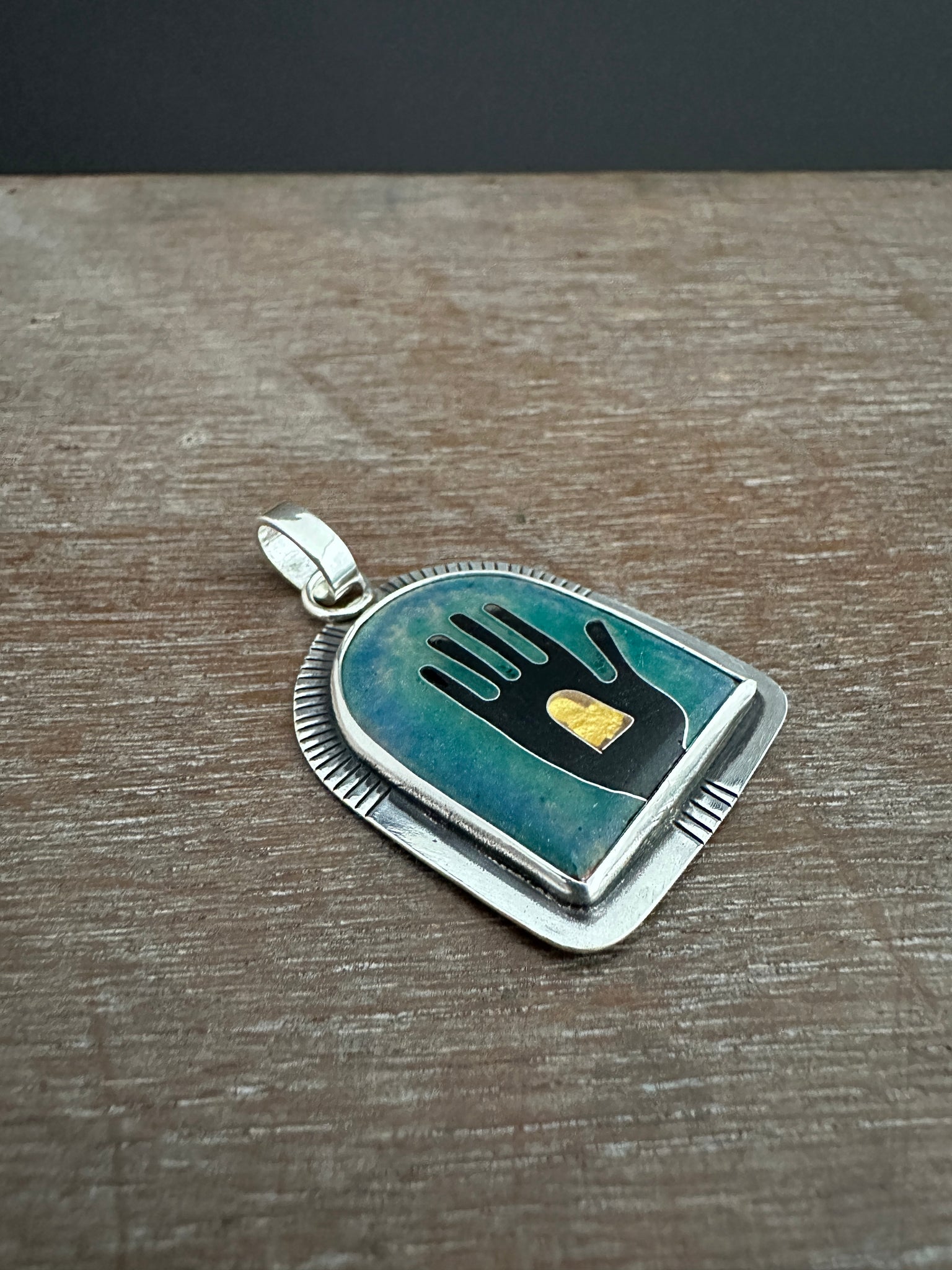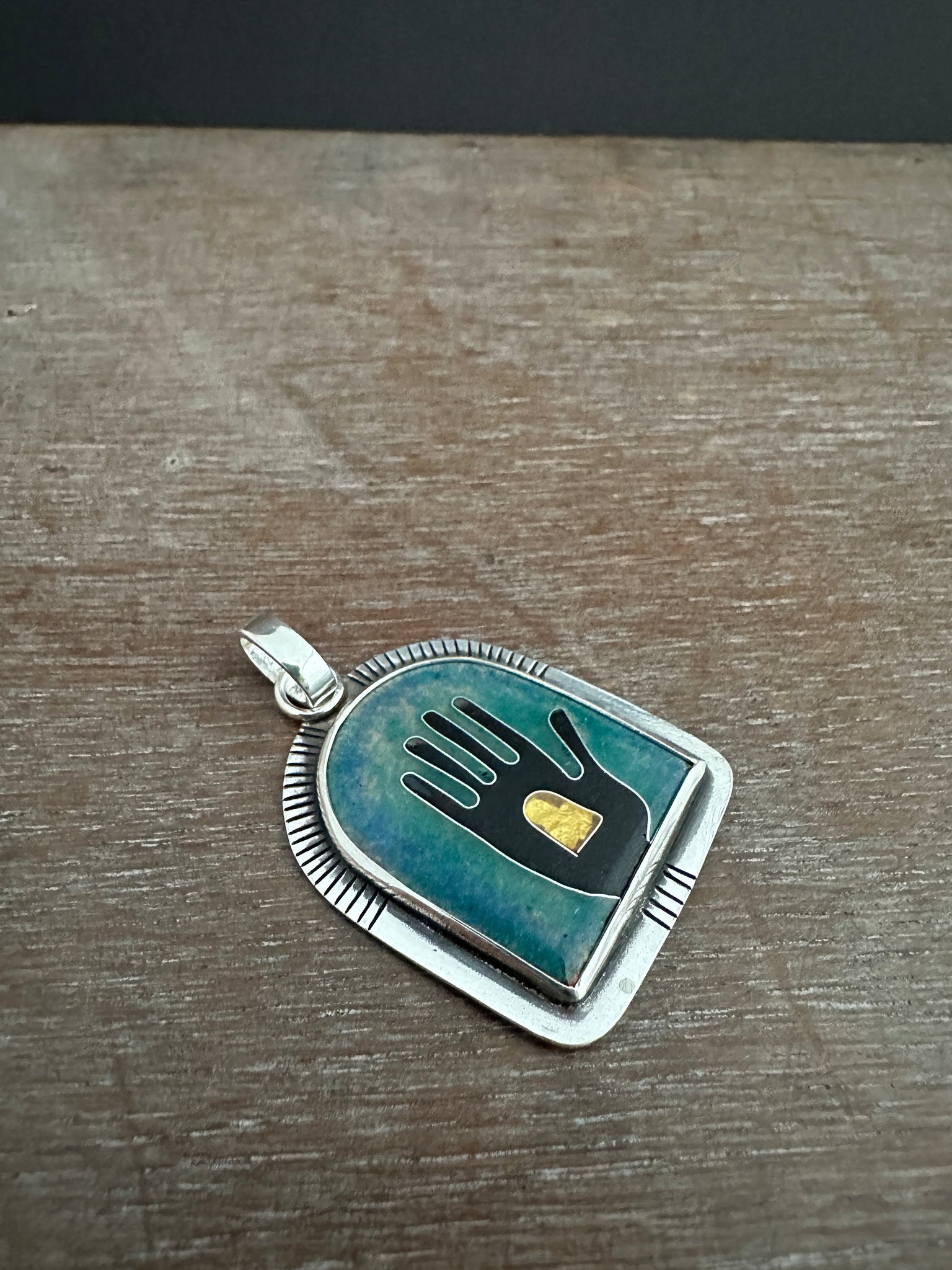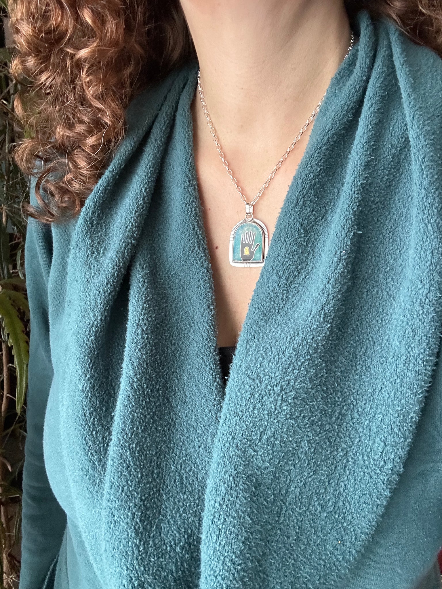 This necklace features a cloisonné enamel I created from glass enamels. This is an ancient and time consuming process where I create an image with tiny silver wires, and the fill them with glass that is melted in a kiln.