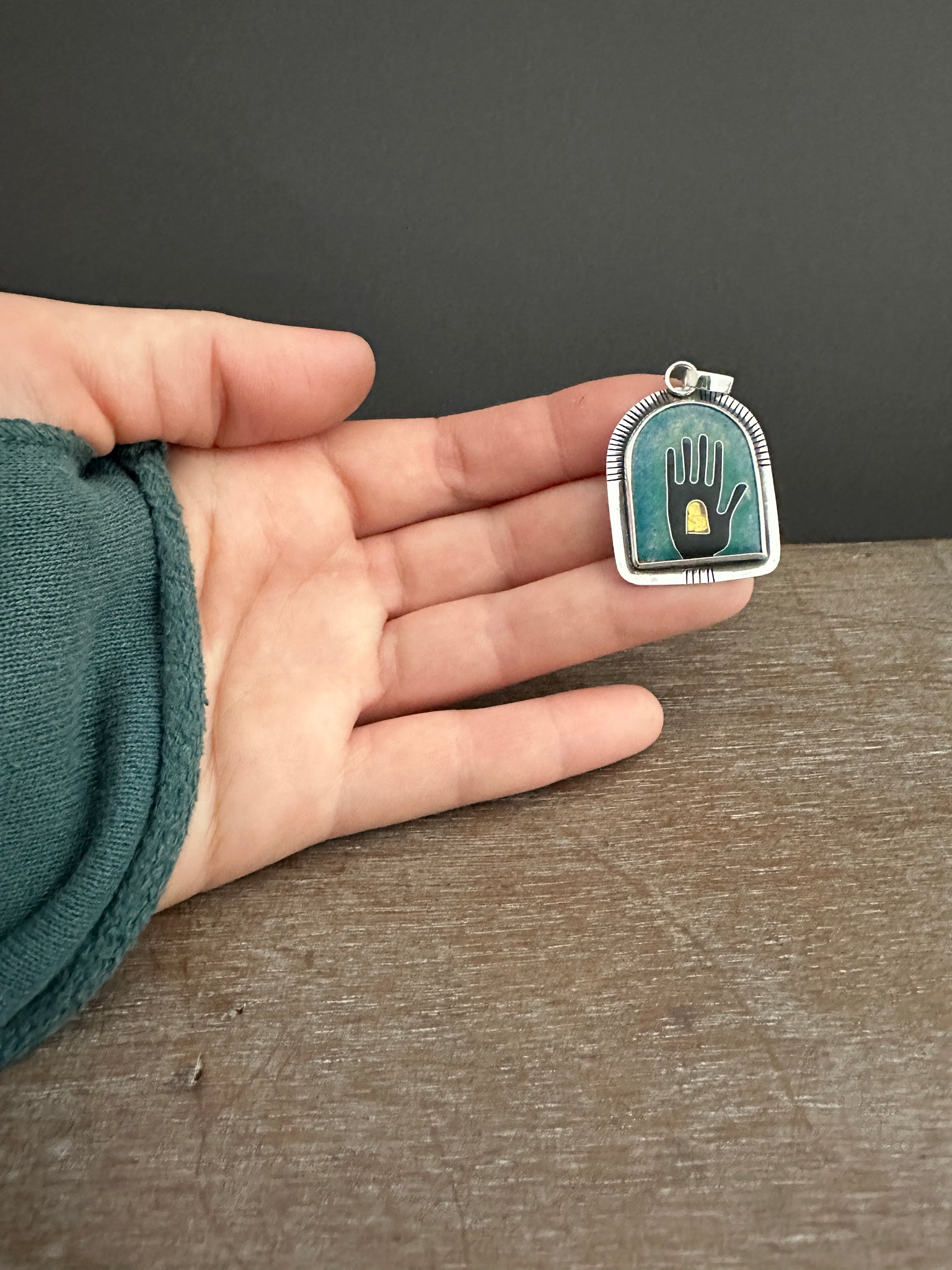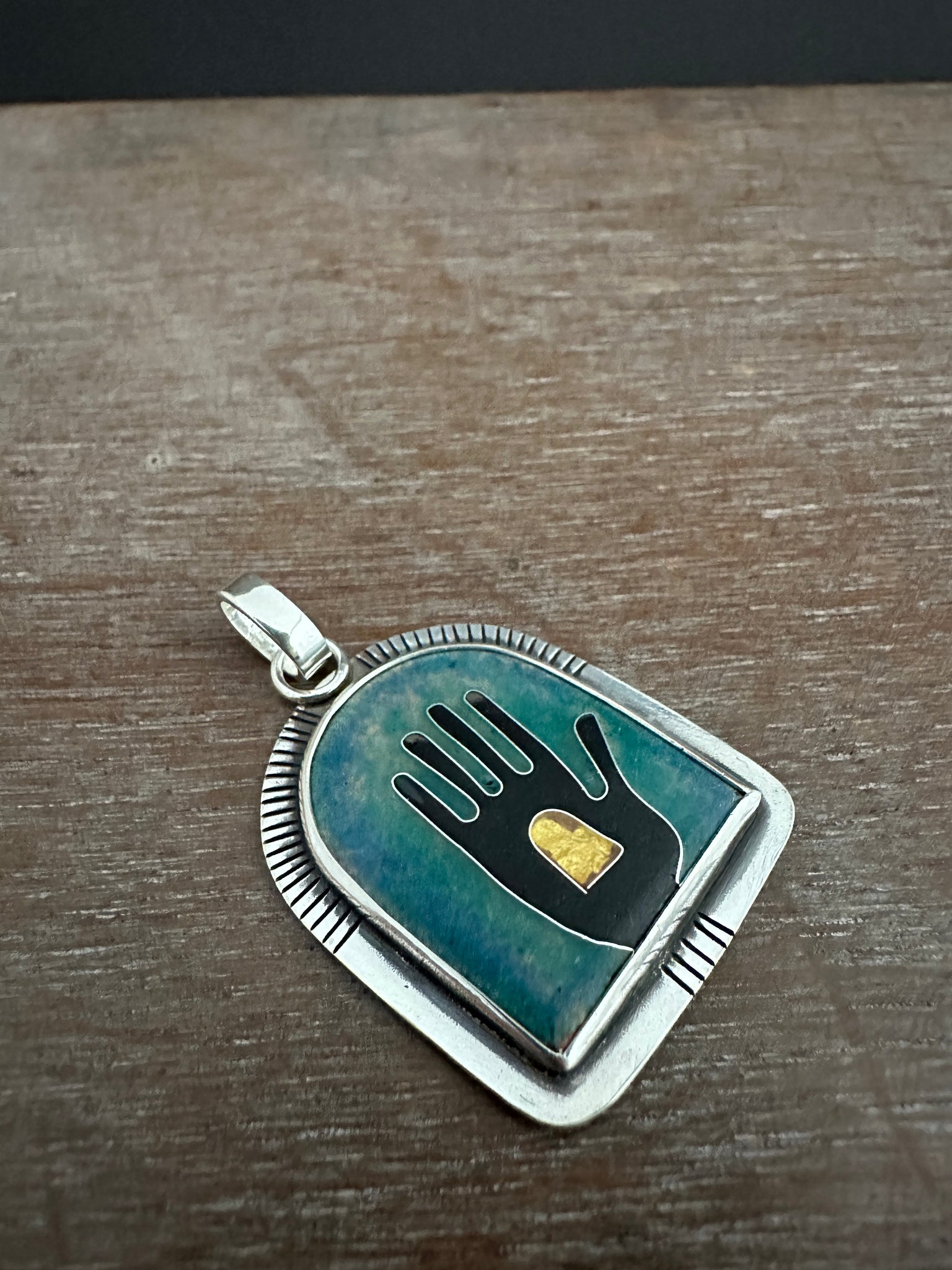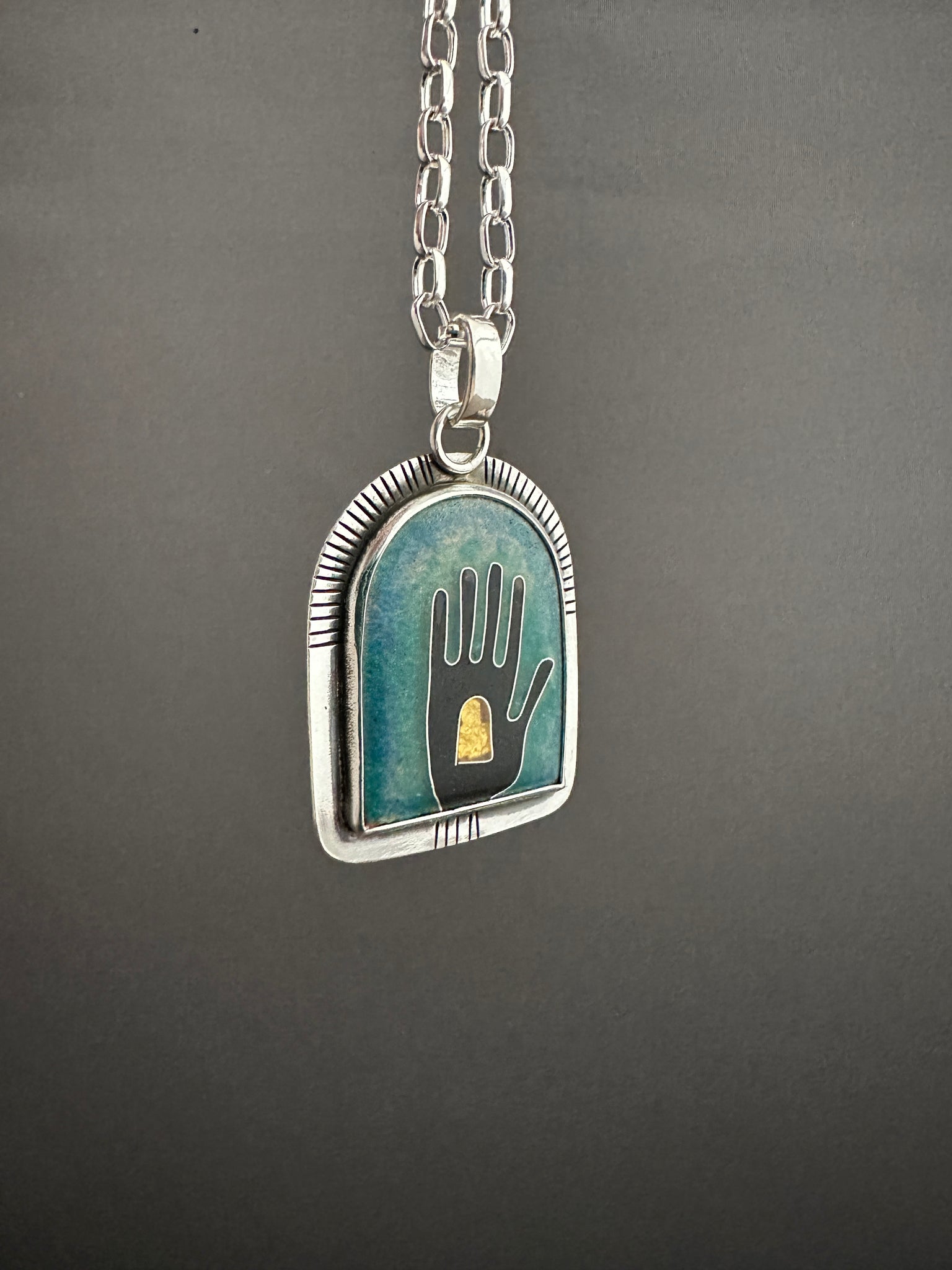 This necklace features a cloisonné enamel I created from glass enamels. This is an ancient and time consuming process where I create an image with tiny silver wires, and the fill them with glass that is melted in a kiln.