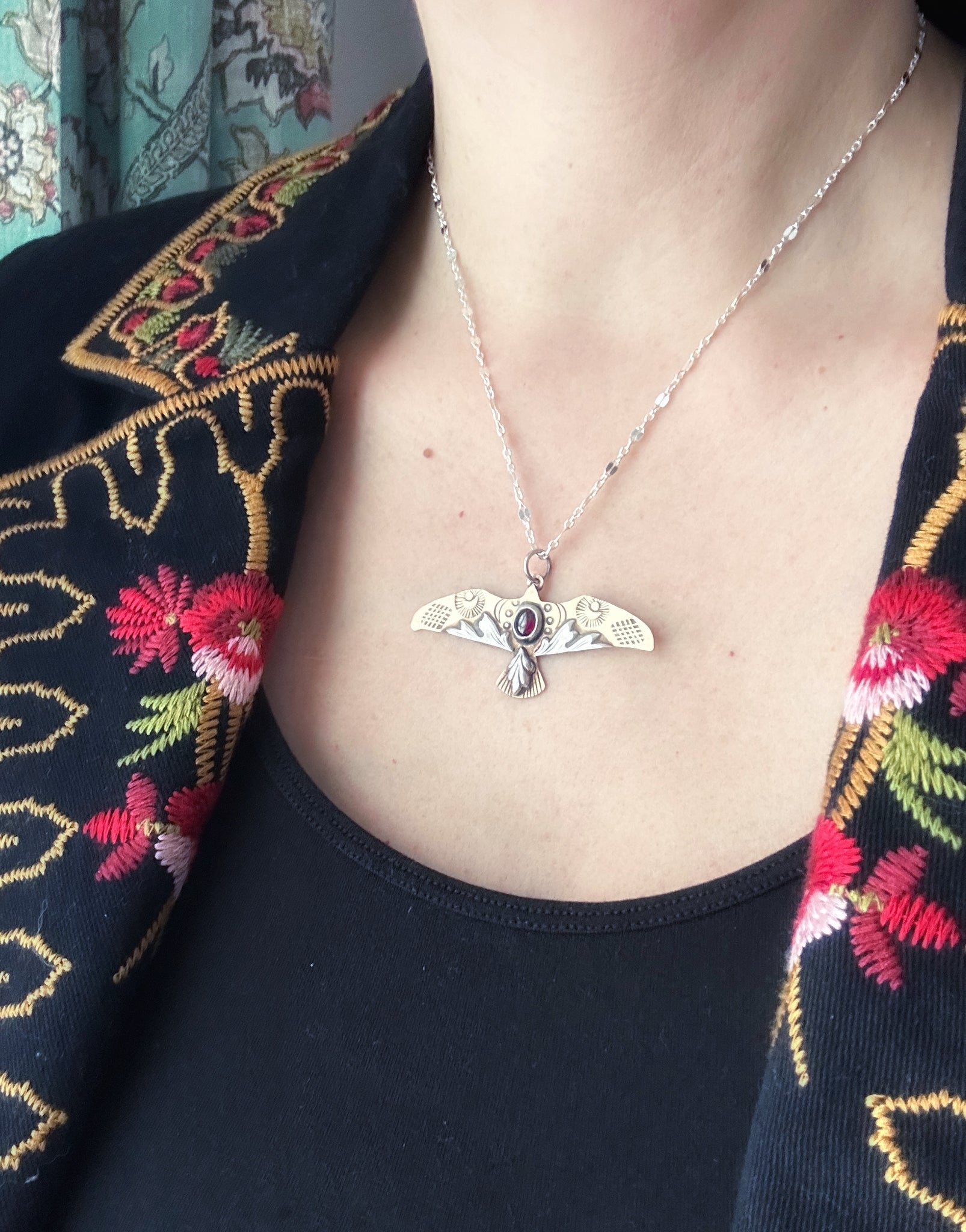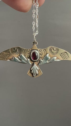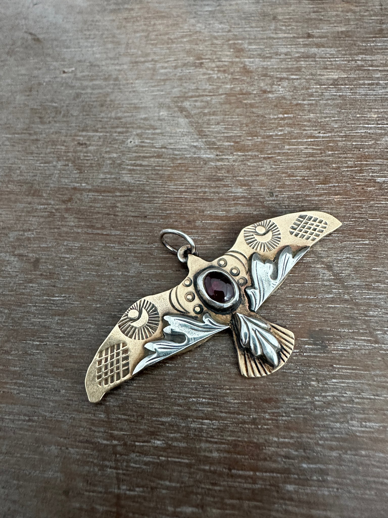 This bird is made from solid bronze. It’s accented with hand stamped, hand cut sterling silver accents, and a deep red garnet. Each bird is one of a kind and unique.