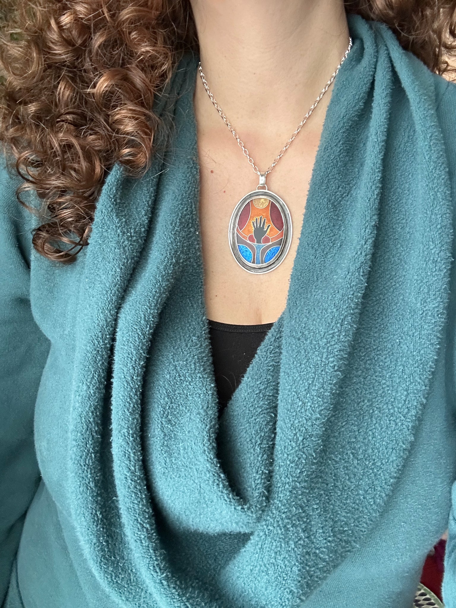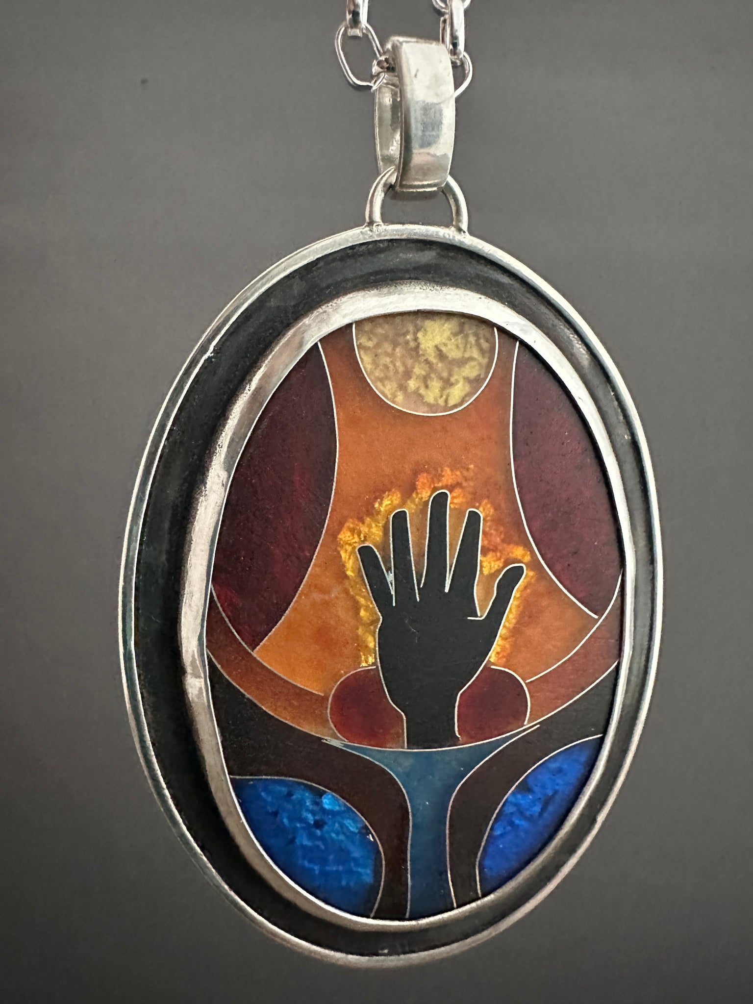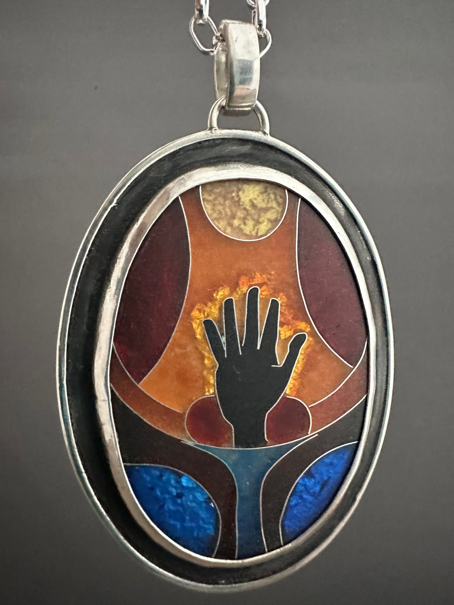 This necklace features a cloisonné enamel I created from glass enamels. This is an ancient and time consuming process where I create an image with tiny silver wires, and the fill them with glass that is melted in a kiln.