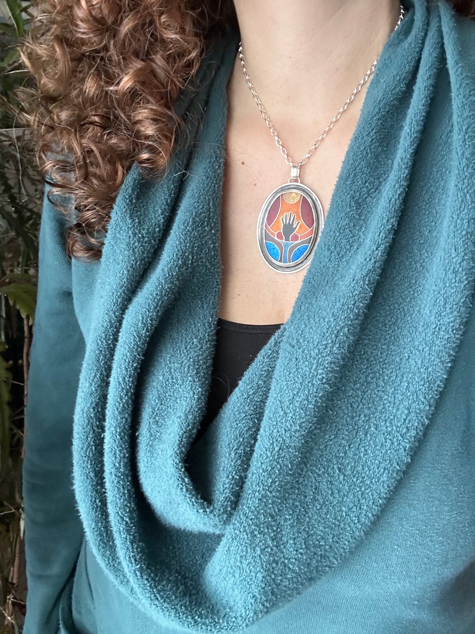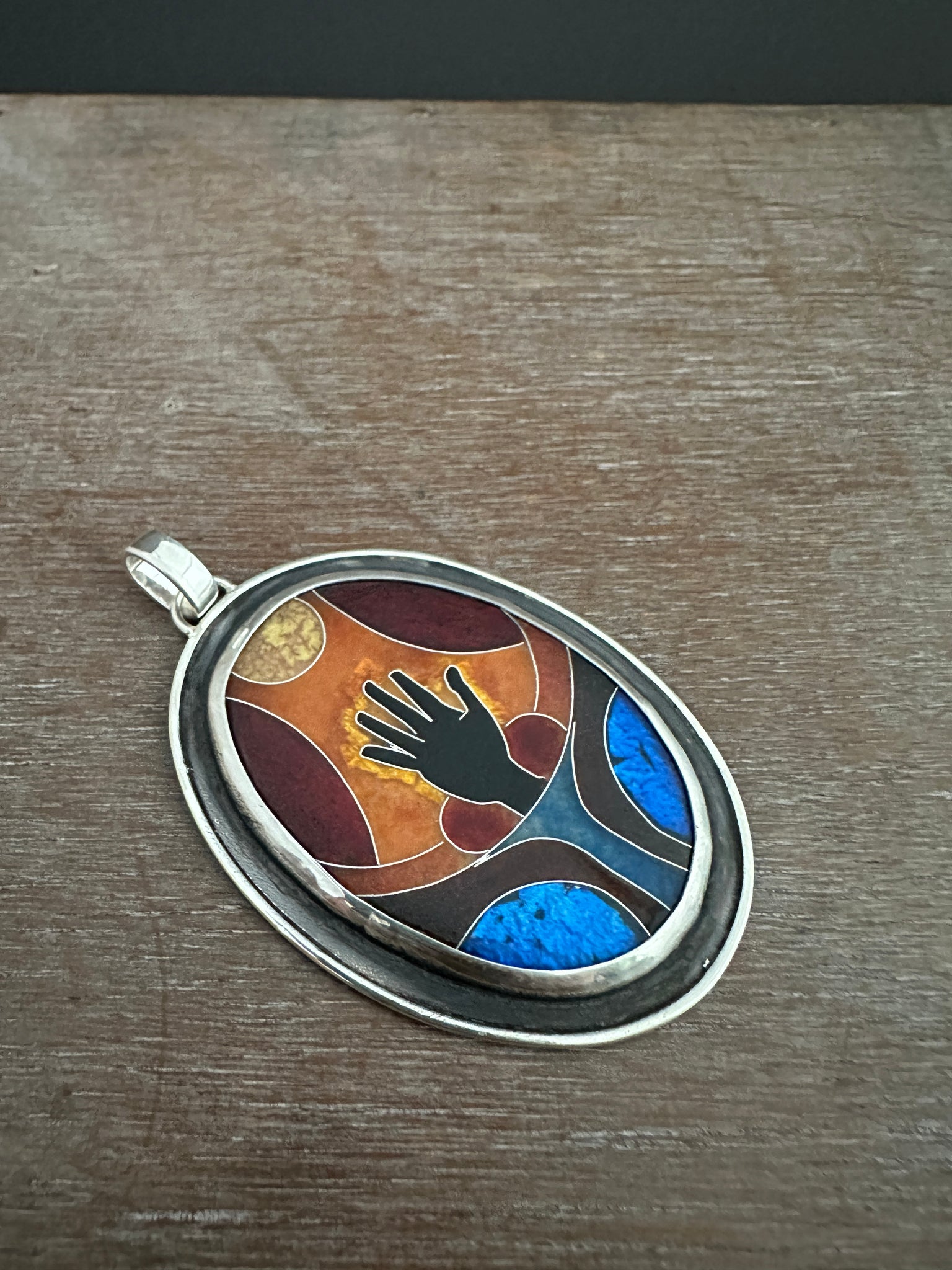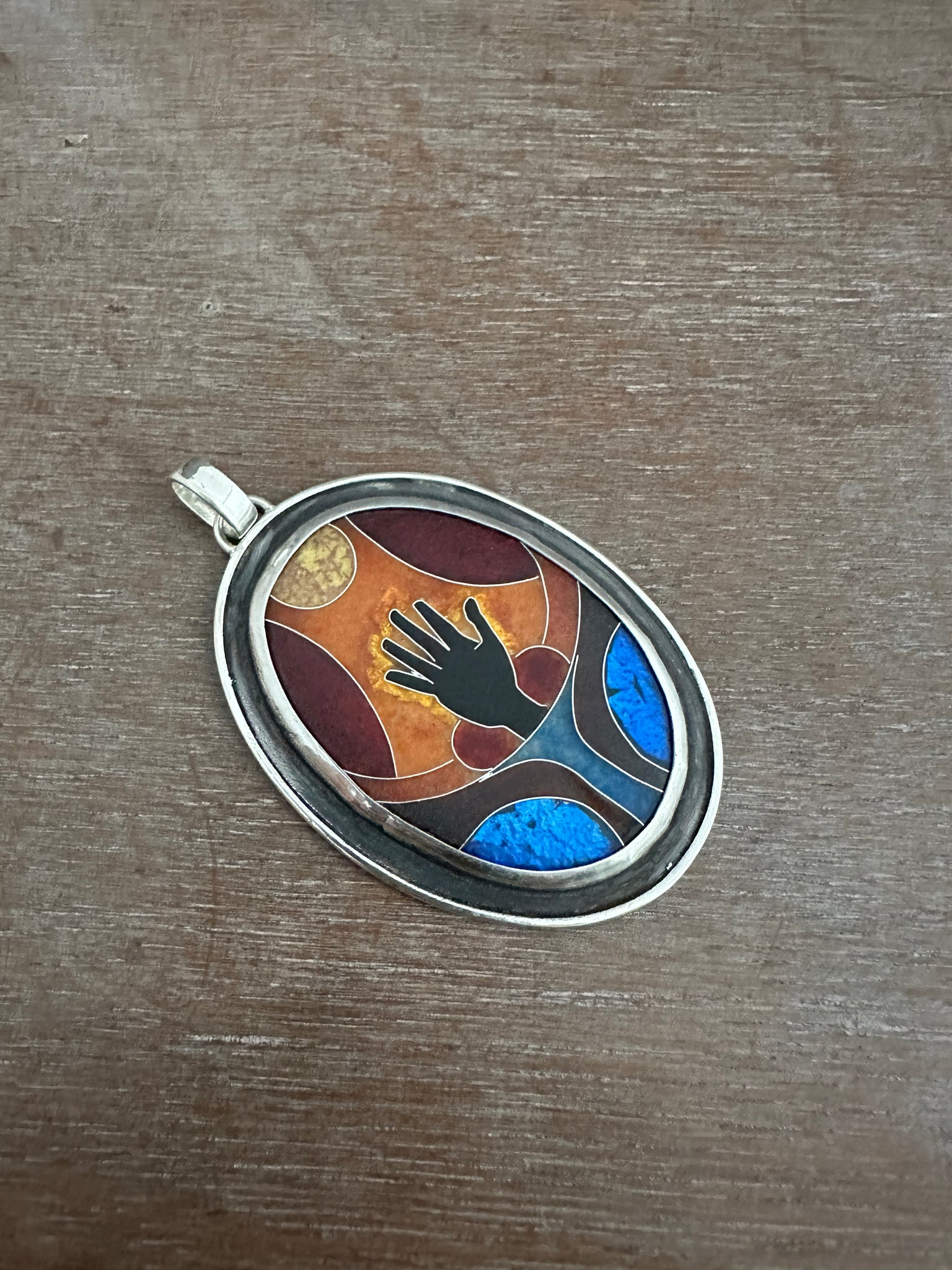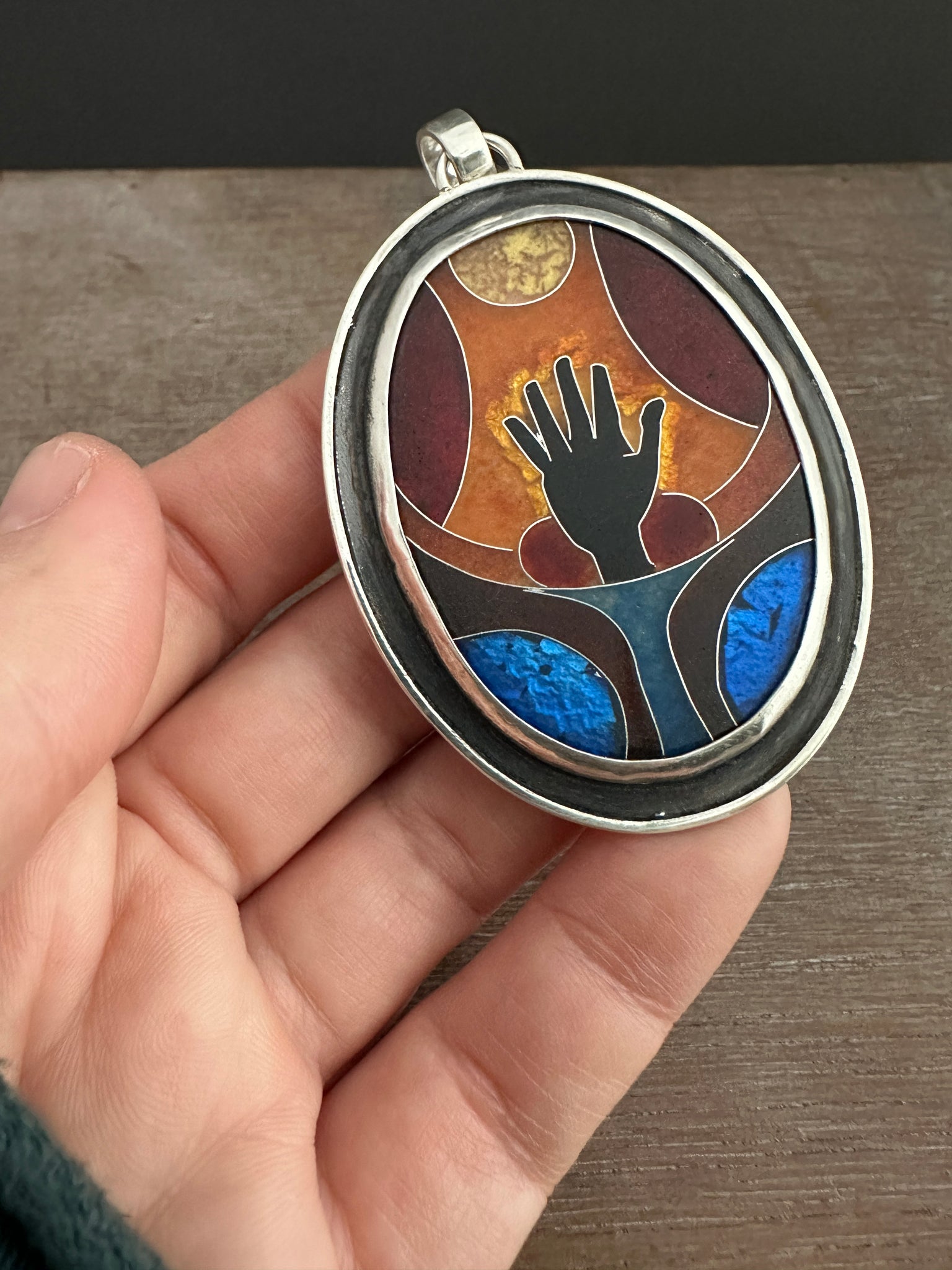 This necklace features a cloisonné enamel I created from glass enamels. This is an ancient and time consuming process where I create an image with tiny silver wires, and the fill them with glass that is melted in a kiln.